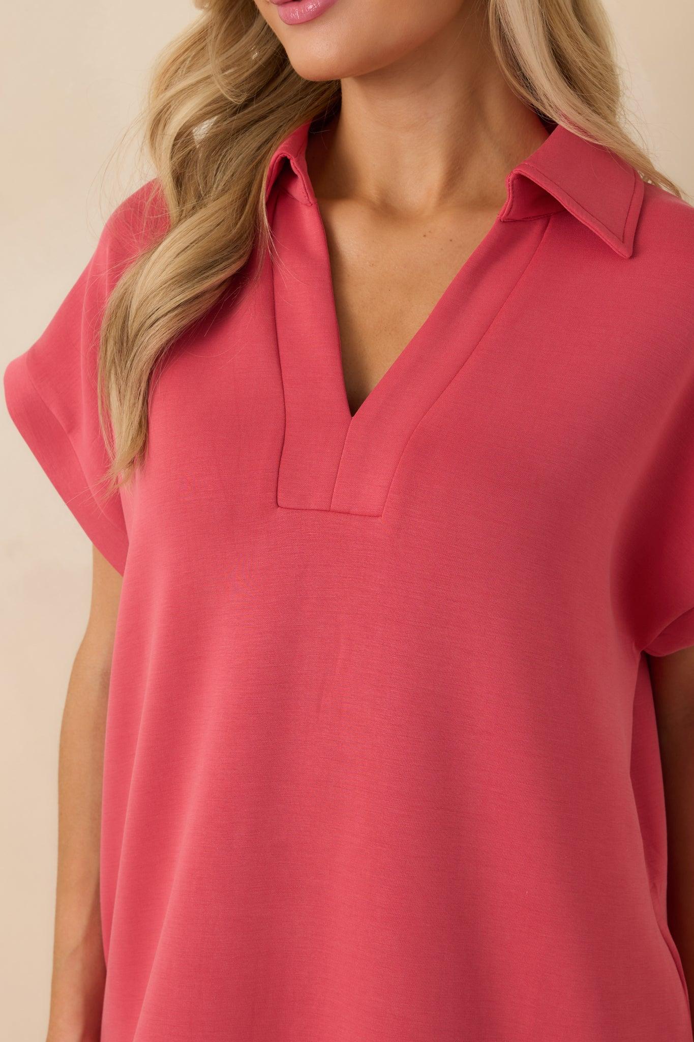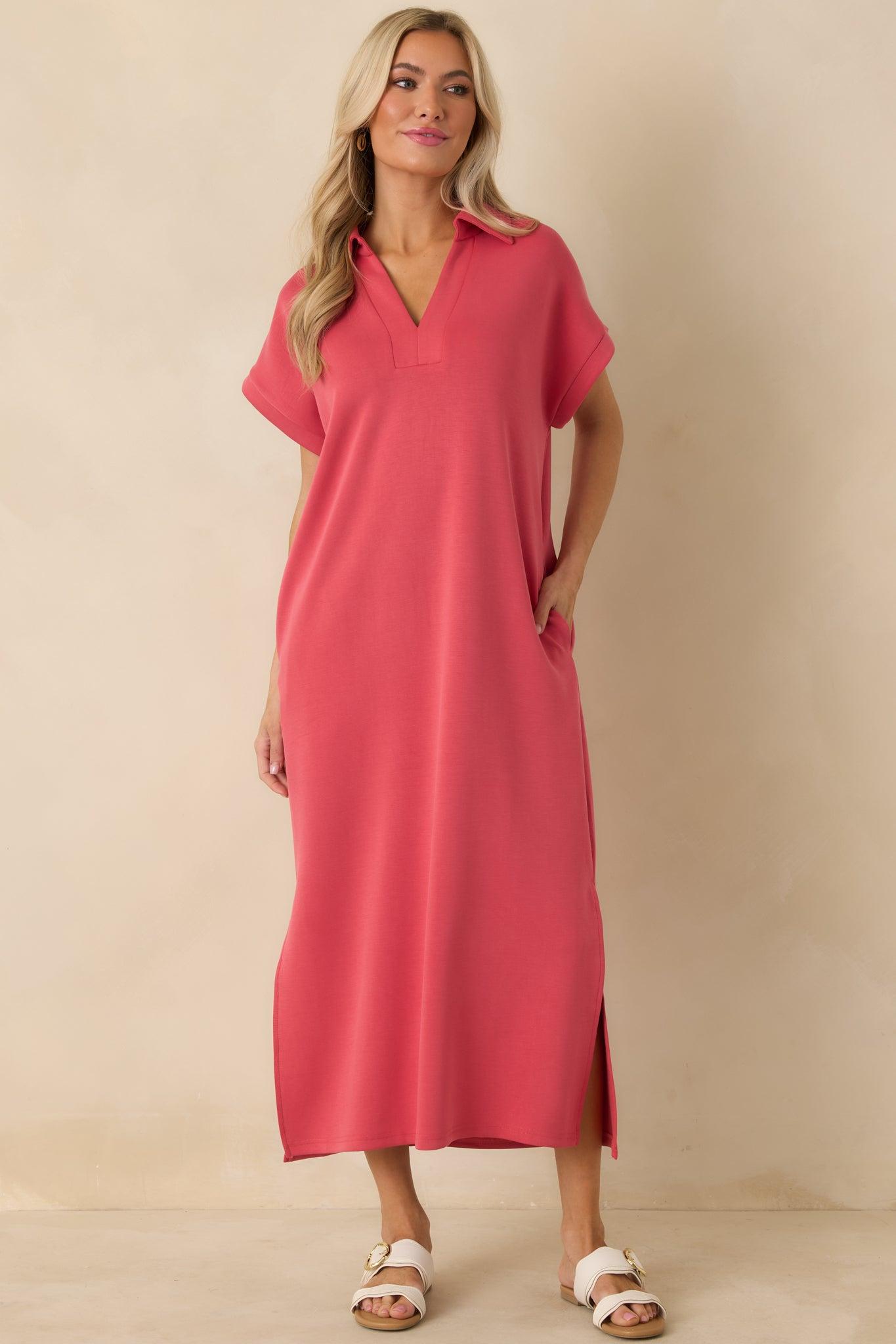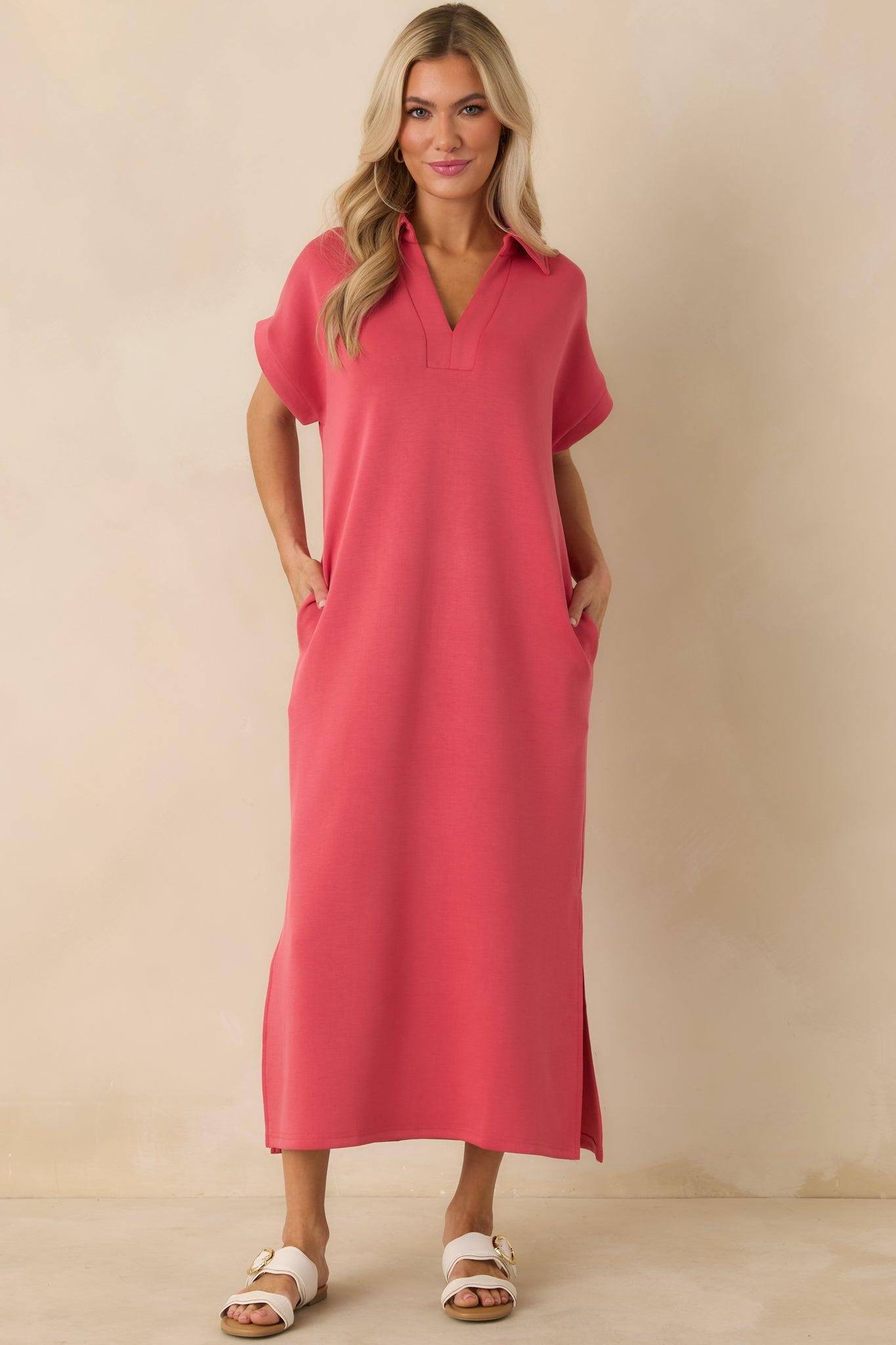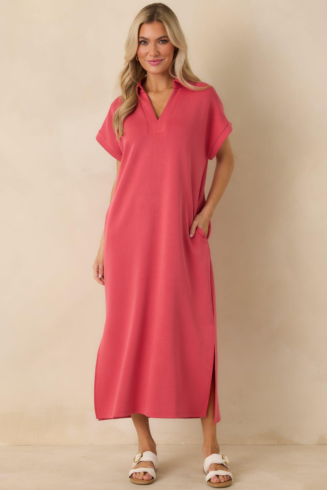 The Made The Right Call Coral Pink Collared Midi T-Shirt Dress is one of those pieces that always feels like the right move. It’s simple, flattering, and perfect for looking put together without any extra effort. This coral pink midi dress features a collared notch v-neckline, short sleeves, buttery soft fabric, side vent leg slits, relaxed fit, and functional pockets. 50% Rayon, 45% Polyester, & 5% Spandex Unlined Hand Wash Cold Manufactured in China Designed in The USA Model is 5'6" and is Wearing a Size Small
