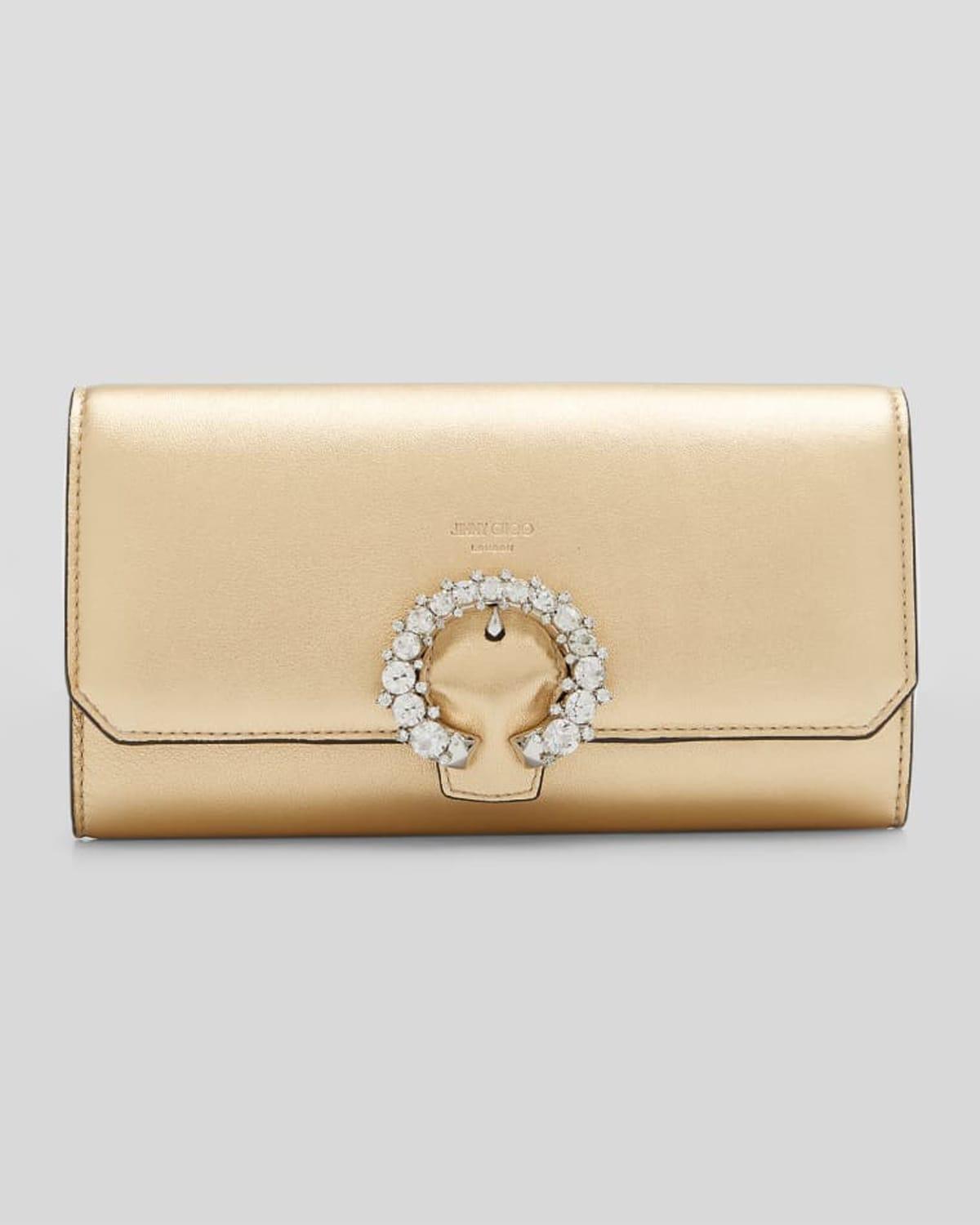 Jimmy Choo "Madeline" wallet in metallic leather and brass Signature embellished buckle accent Detachable chain shoulder strap, 20.5" drop Flap top with magnetic closure Interior, one zip pocket Approx. 4.1"H x 7.7"W x 2.4"D Item Weight (Lbs.): 0.7 Made in Italy