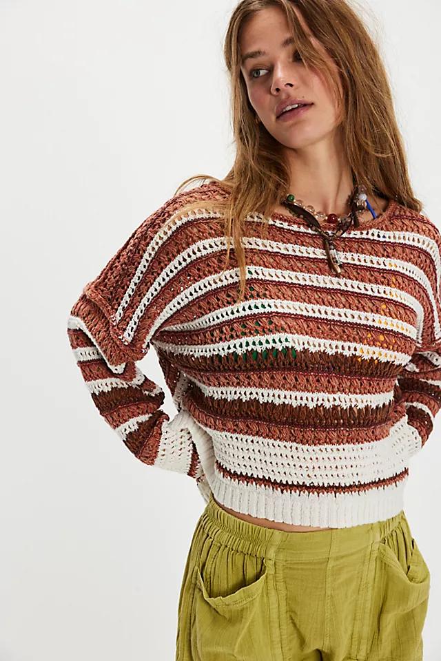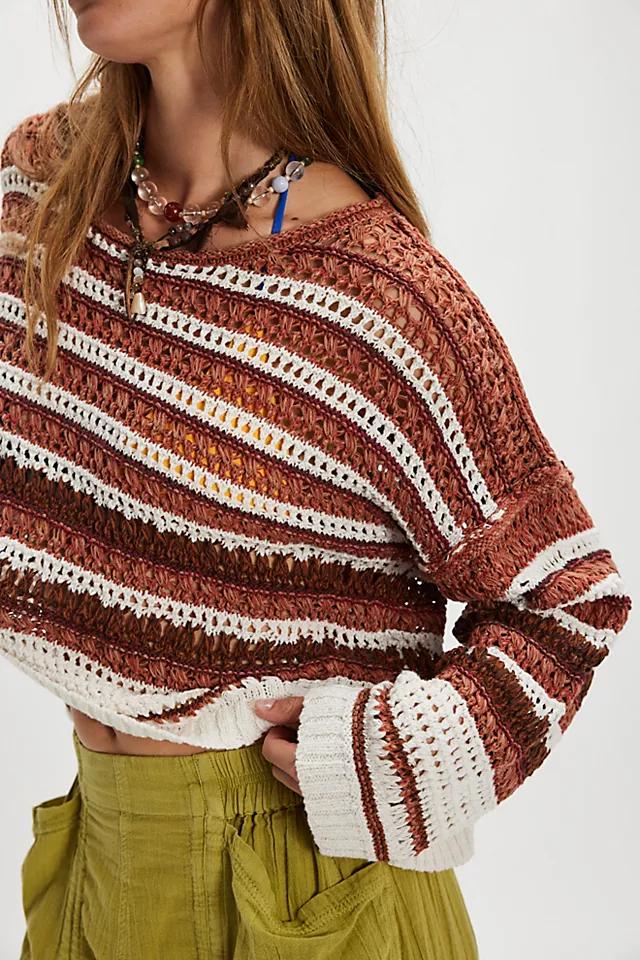 Packed with pattern and textured, this cropped pullover is featured in an open-knit fabrication and striped print for the perfect detailed layer. * Boat neckline * Striped print * Open-knit cotton blend * Vented hem * Dropped shoulders