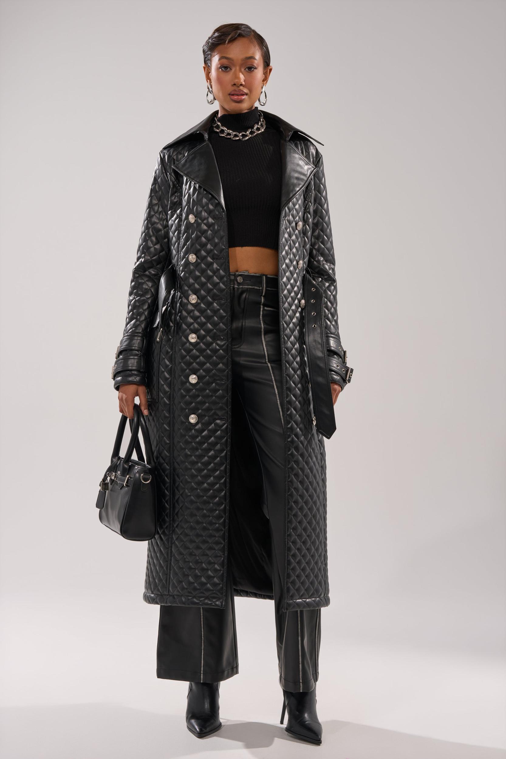 Give quiet luxury with the AKIRA Label Madison Ave Quilted Trench. This long black quilted faux leather trench coat delivers bold, high-fashion sophistication with its full-length silhouette, diamond-stitched texture, and double-breasted design accented by silver engraved button enclosures and matching epaulettes detailing. Featuring a wide notched collar, adjustable belted waist, deep side pockets, a single back vent, and two matching silver buckle cuffs per sleeve, the coat offers a structured, cinched fit that flatters while adding a dramatic edge. - Shell: 55% Polyester 45% PU, Lining: 95% Polyester 5% Spandex- No Stretch- Imported (all measurements are approximate from size small)- 51” Shoulder to Hem- 16” Shoulder to Shoulder- 26” Sleeve- 50” Belt- Model is 5’9” and wearing size smallProduct ID: 1074922