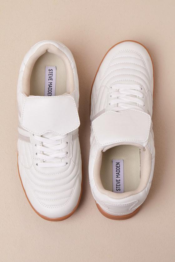Catch your crush's attention with fresh new kicks like the Steve Madden Madrid White Multi Quilted Lace-Up Sneakers! Quilted faux leather shapes these upgraded sneakers with a rounded-toe upper and a low-cut, lightly padded collar. Classic lace-up vamp boasts an extended tongue detail at the front that secures with a VELCRO® closure. Light beige woven fabric creates a striped design at the instep and outstep, all atop a textured brown sole.