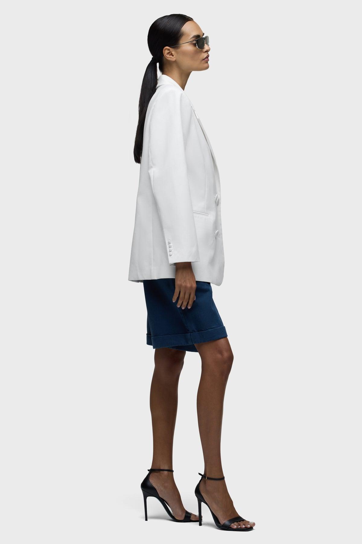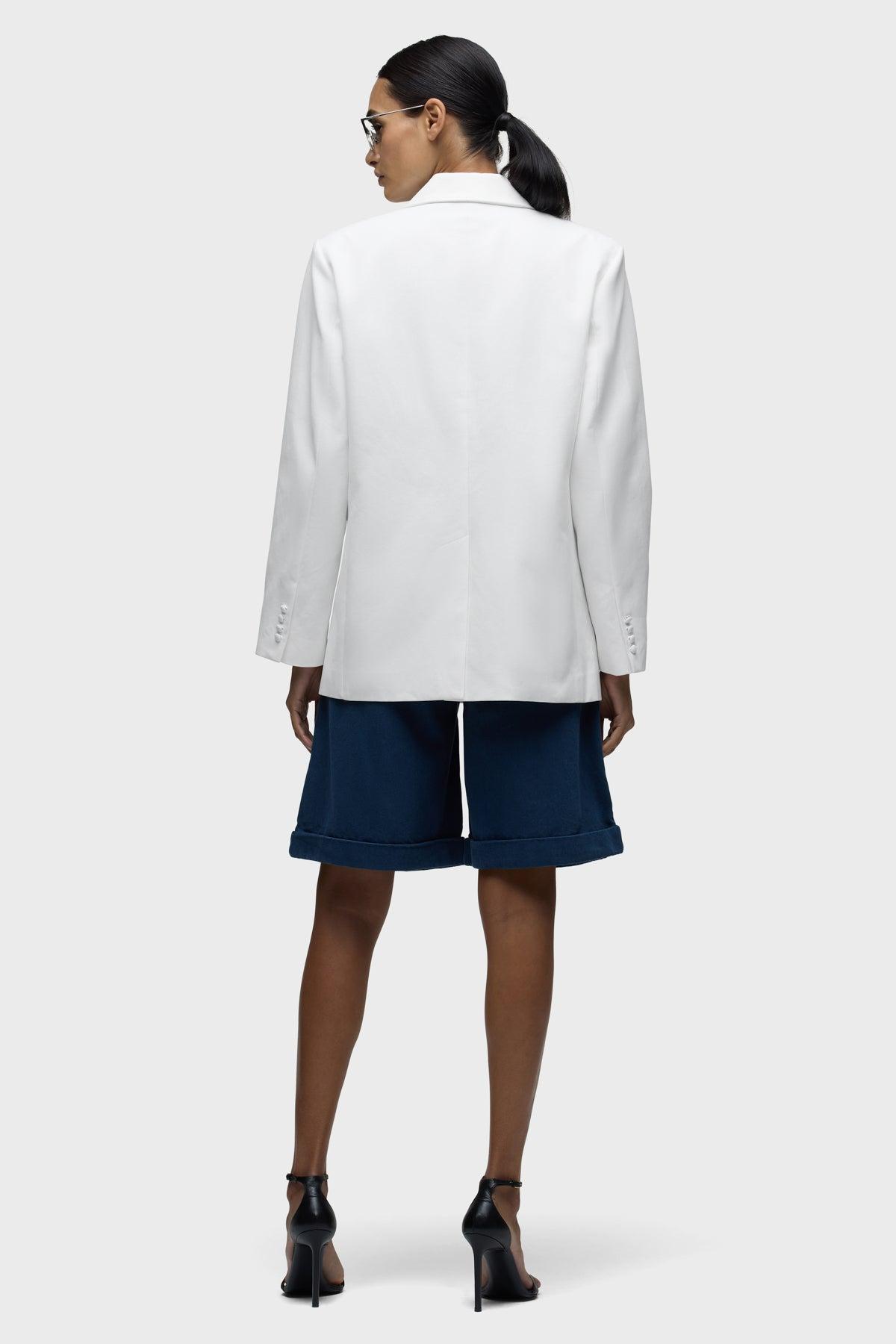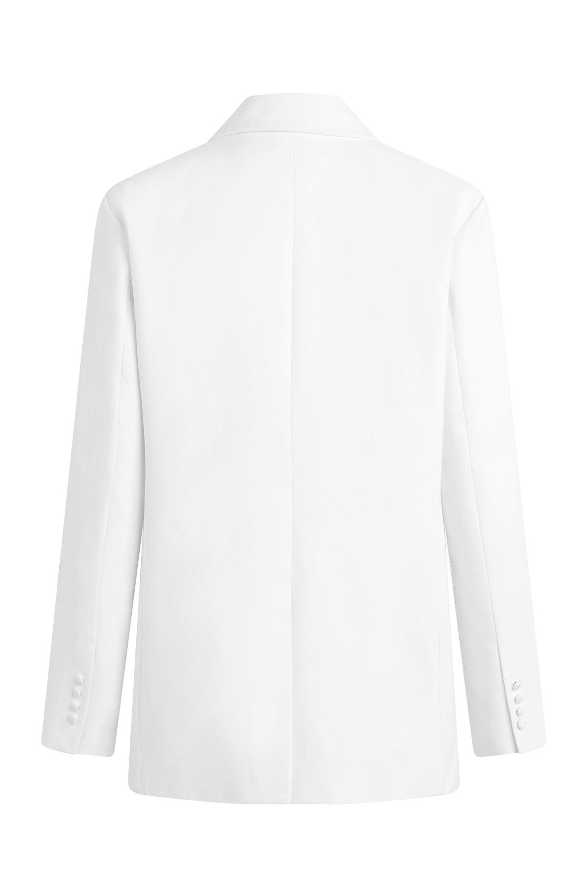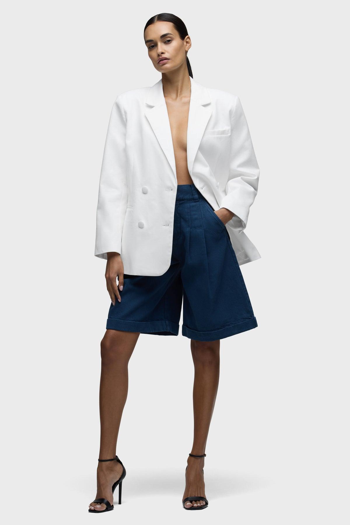 Description Part of our Brooks Nader collab capsule, the Mae Oversized Blazer in White is a fully lined, double breasted blazer with self covered buttons, an oversized body and shoulder pads. This capsule was curated by model Brooks Nader and features her personal closet must-haves. Product Details Body Length: 29", Chest: 42", Sleeve Length: 25.5"Model Height 5'9"Model wearing size SMeasurements based on size S Fit & Care Content: 79% Cotton, 21% ViscoseMachine wash cold with like colorsDo not bleachTumble dry low or hang to dry