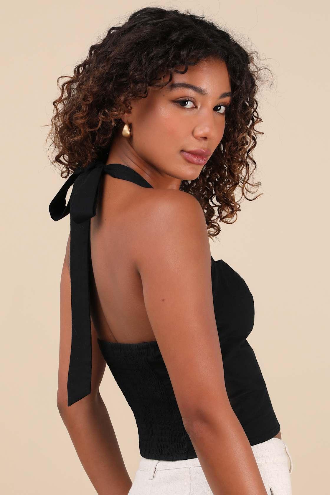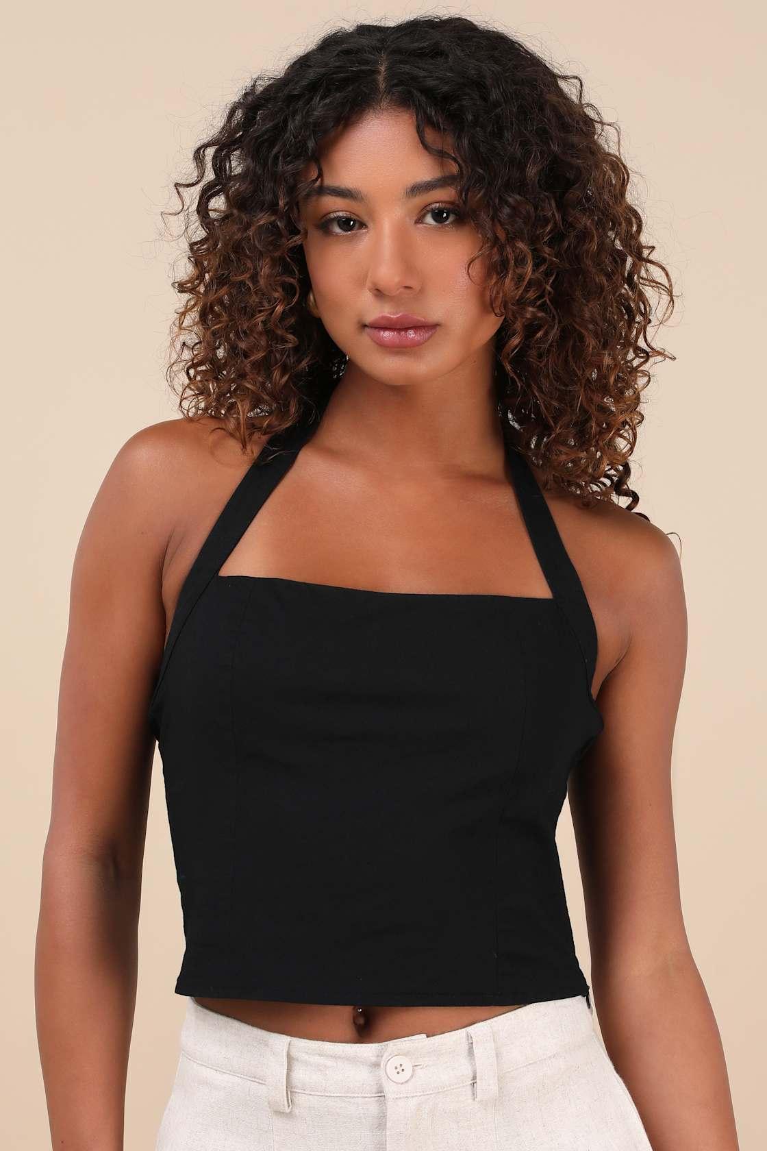 Don't worry, the Lulus Maebyn Black Halter Crop Top will easily pair with all your favorite summer bottoms! This cotton-linen blend woven top has a simple yet impressive design, featuring a tying halter neckline and a fitted bodice with a flirty cropped hem. Smocking at back allows for the perfect fit. Hidden side zipper.