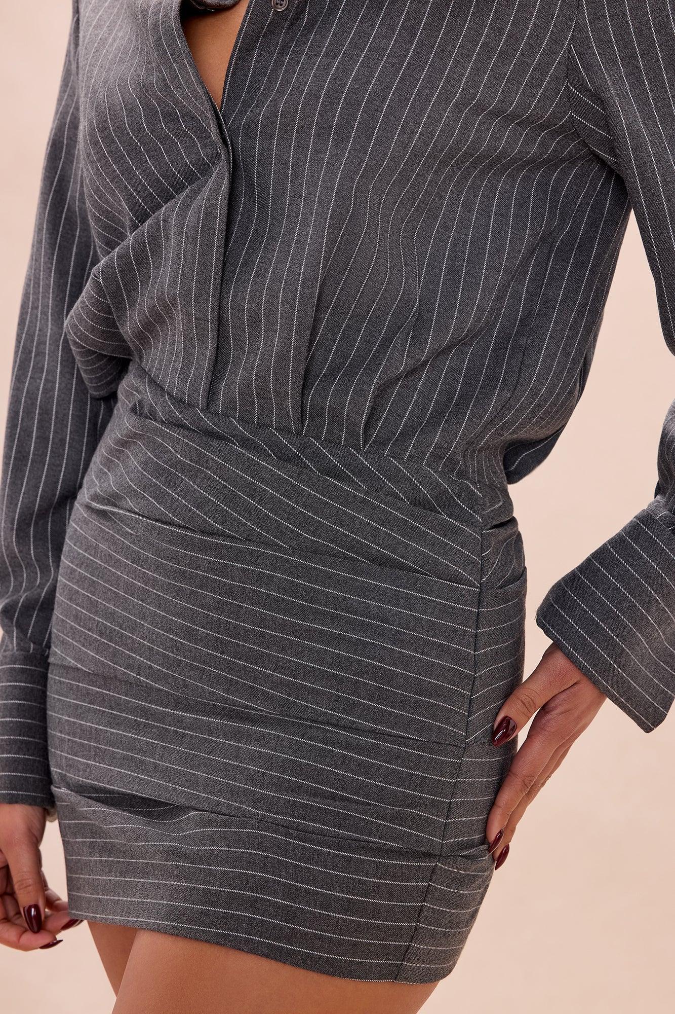 Available In Grey. Mini Dress Long Sleeve Collared Ruched Button Up Hidden Side Zipper Closure Non Stretch Self: 64% Polyester 34% Rayon 2% Spandex Imported California Proposition 65WARNING: Cancer and Reproductive Harm - www.P65Warnings.ca.gov.