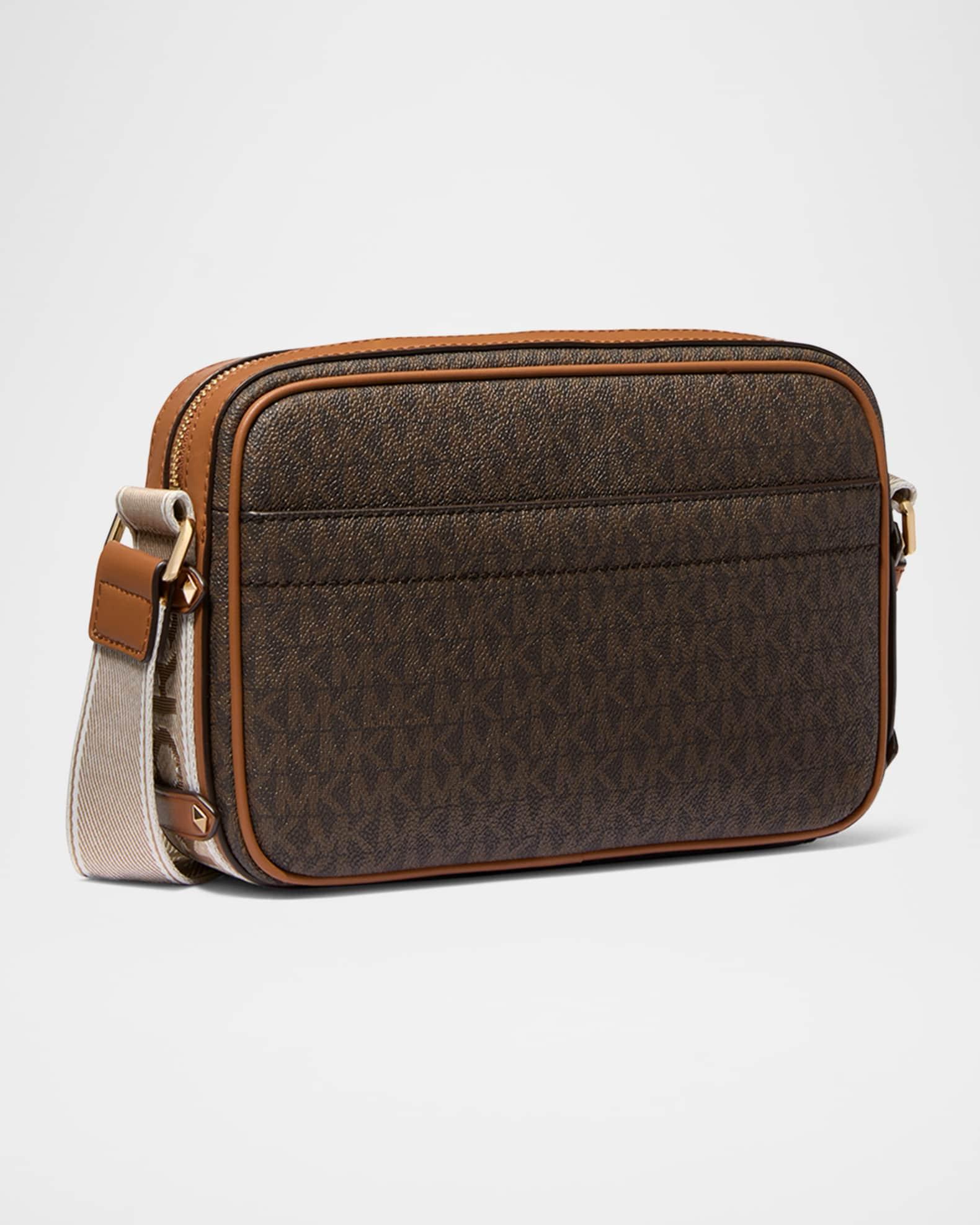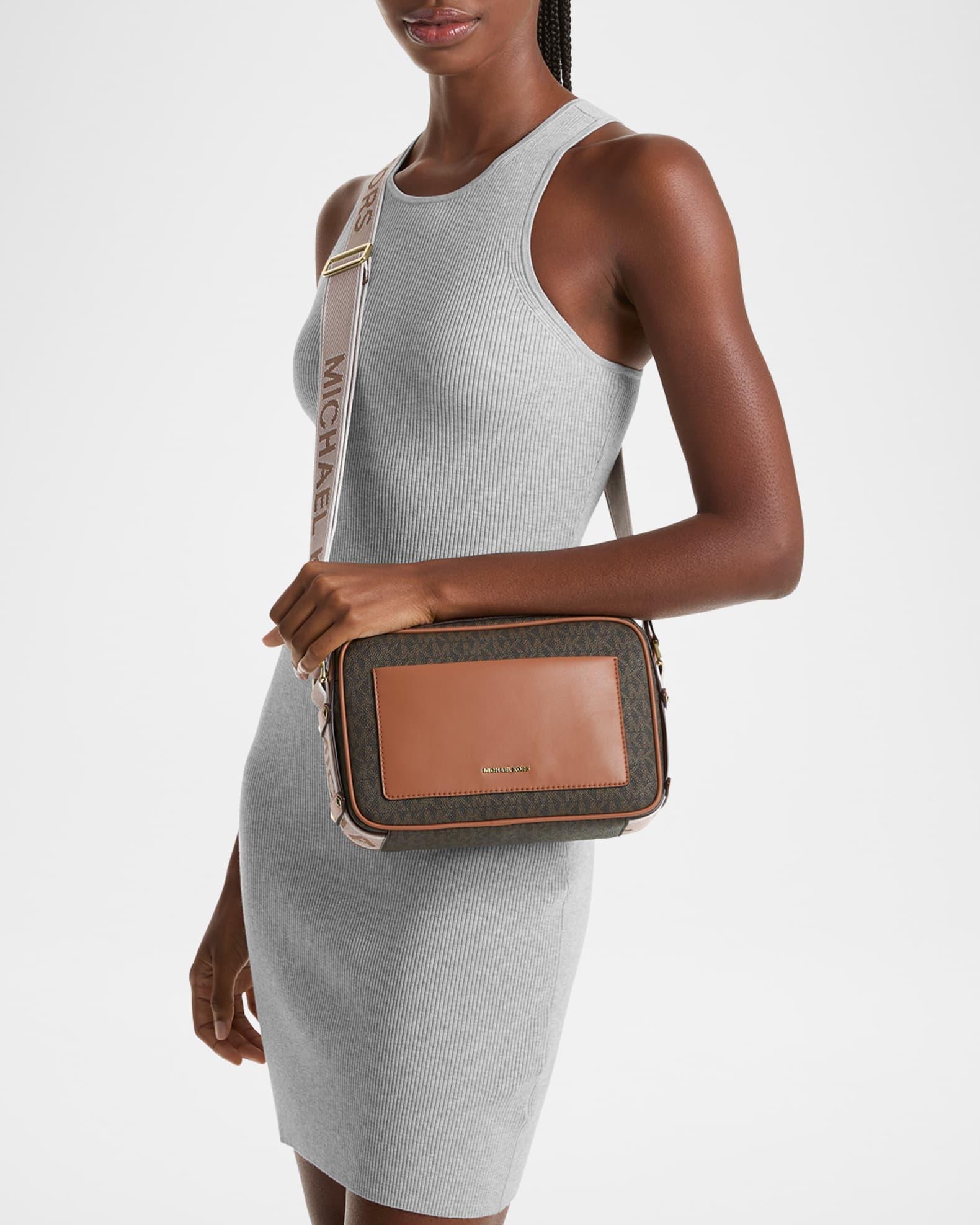 MICHAEL Michael Kors "Maeve" coated signature logo canvas crossbody bag in a camera-inspired silhouette Detachable, adjustable web crossbody strap Zip top closure Exterior, two slip pockets Interior, one slip pocket Lining: Polyester Approx. 6.8"H x 10.8"W x 4.3"D PVC/polyester/polyurethane/leather Wipe clean Imported
