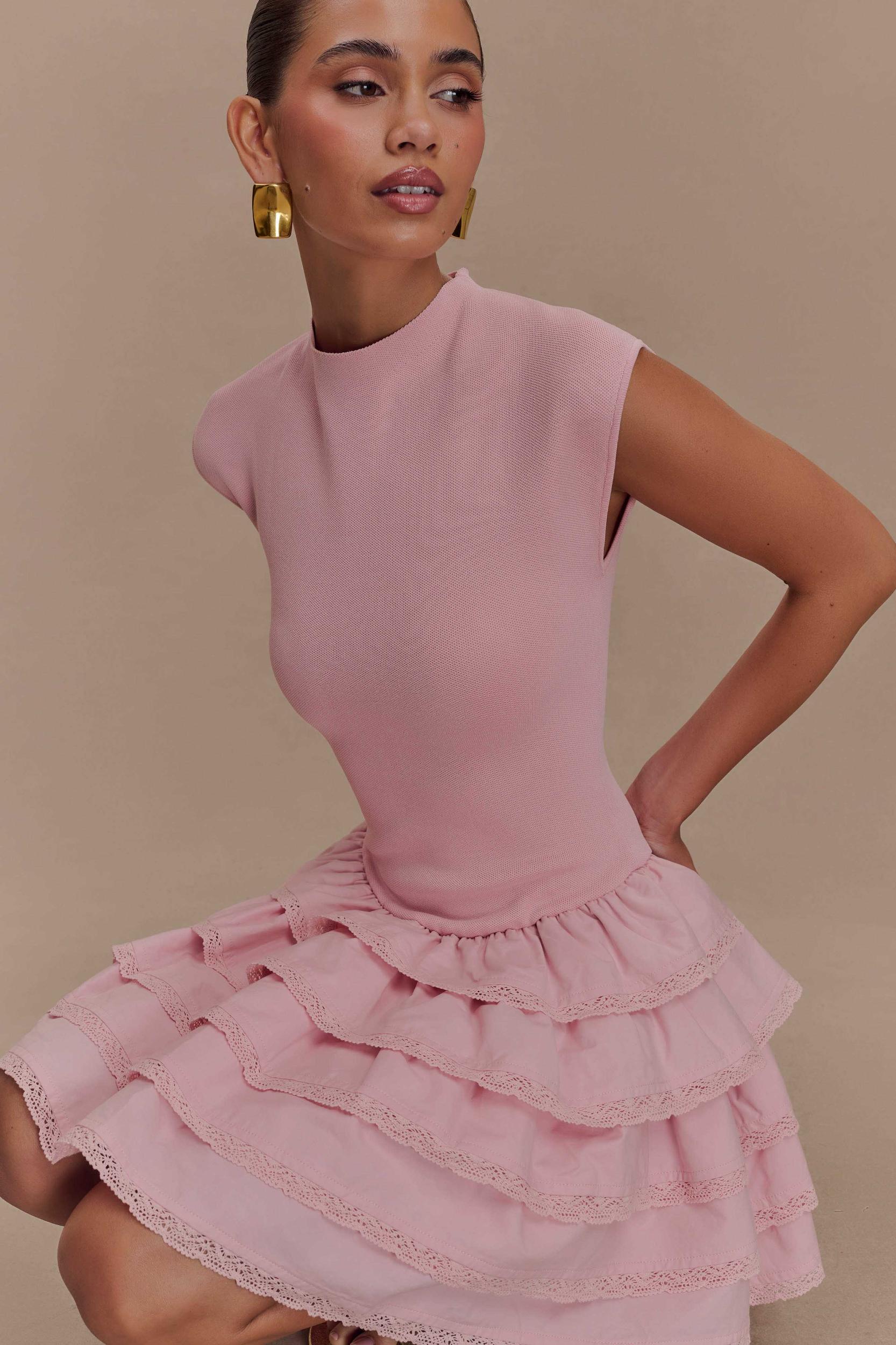 A mini dress made to move. The MAEVE Ruffle Knit Mini Dress blends sophistication with playful details. The high neckline and cap sleeves create a polished, fitted bodice. The drop waist design enhances your shape, flowing into a contrast skirt with gathered volume for a flattering, dynamic silhouette. Delicate lace trim along the hem adds a feminine finish. Perfect for any occasion, this mini-length dress offers a balance of chic and fun, making it a wardrobe must-have.
