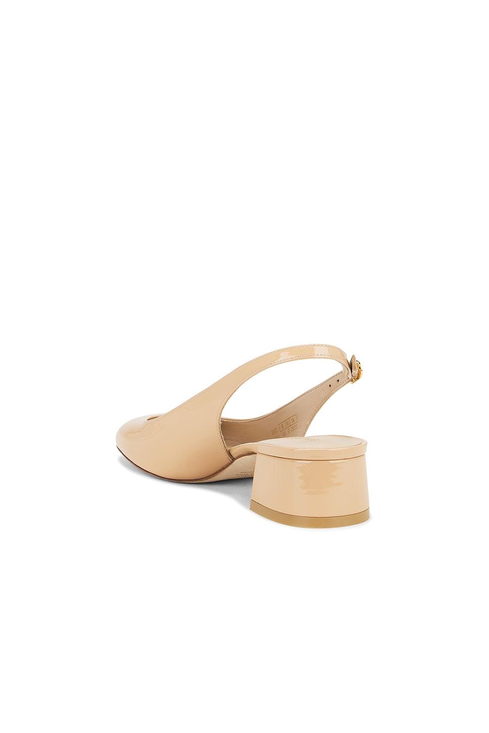 Patent leather upper with leather sole. Slingback styling with gold-tone buckle closure. Cushioned leather footbed. Block heel. Rounded toe. Approx 40mm/ 1.5 inch heel. Made in Spain. Revolve Style No. STUA-WZ609. Manufacturer Style No. SK675.