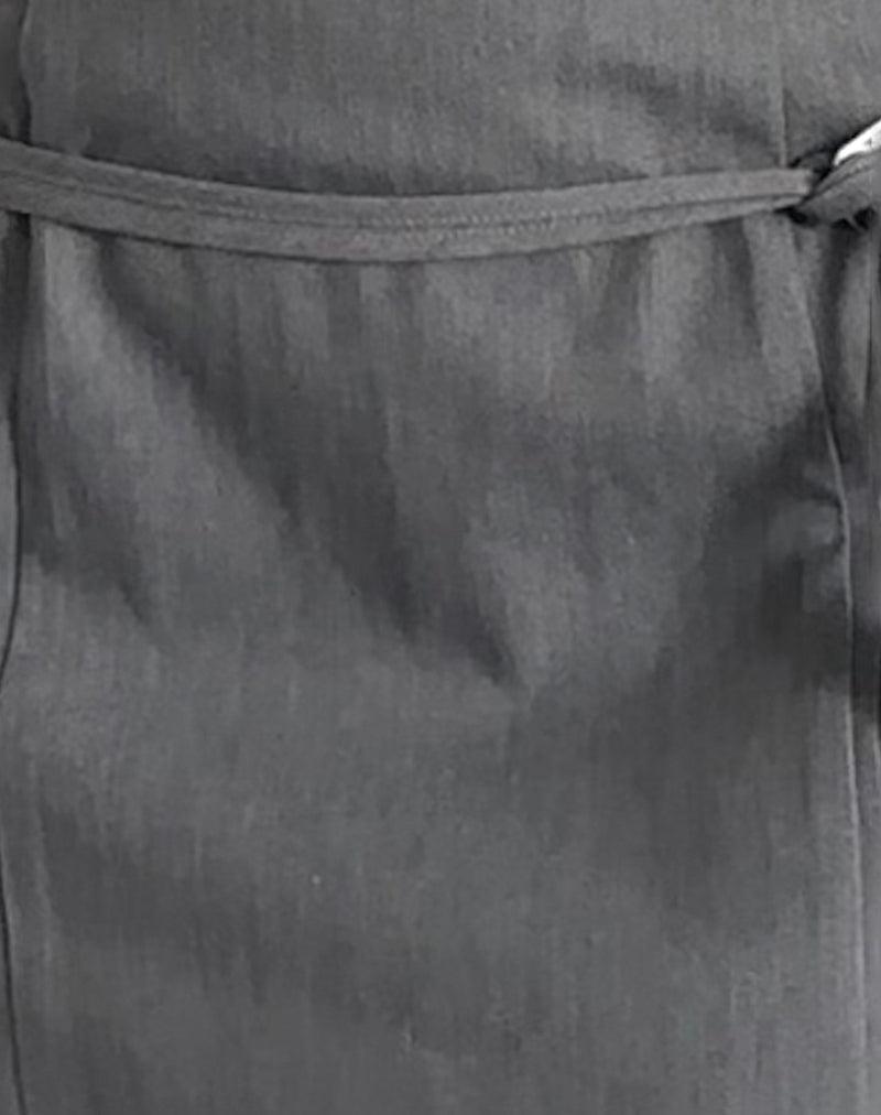 The Magaska mini Dress in charcoal soft tailoring is a bandeau dress featuring an a-line skirt with a drop low waistband. It includes a waist belt strap in self fabric with a silver buckle clasp for added detail. The dress also has a concealed zip entry at the centre back. MODEL WEARS SIZE: EXTRA SMALL - MODEL HEIGHT:5'7