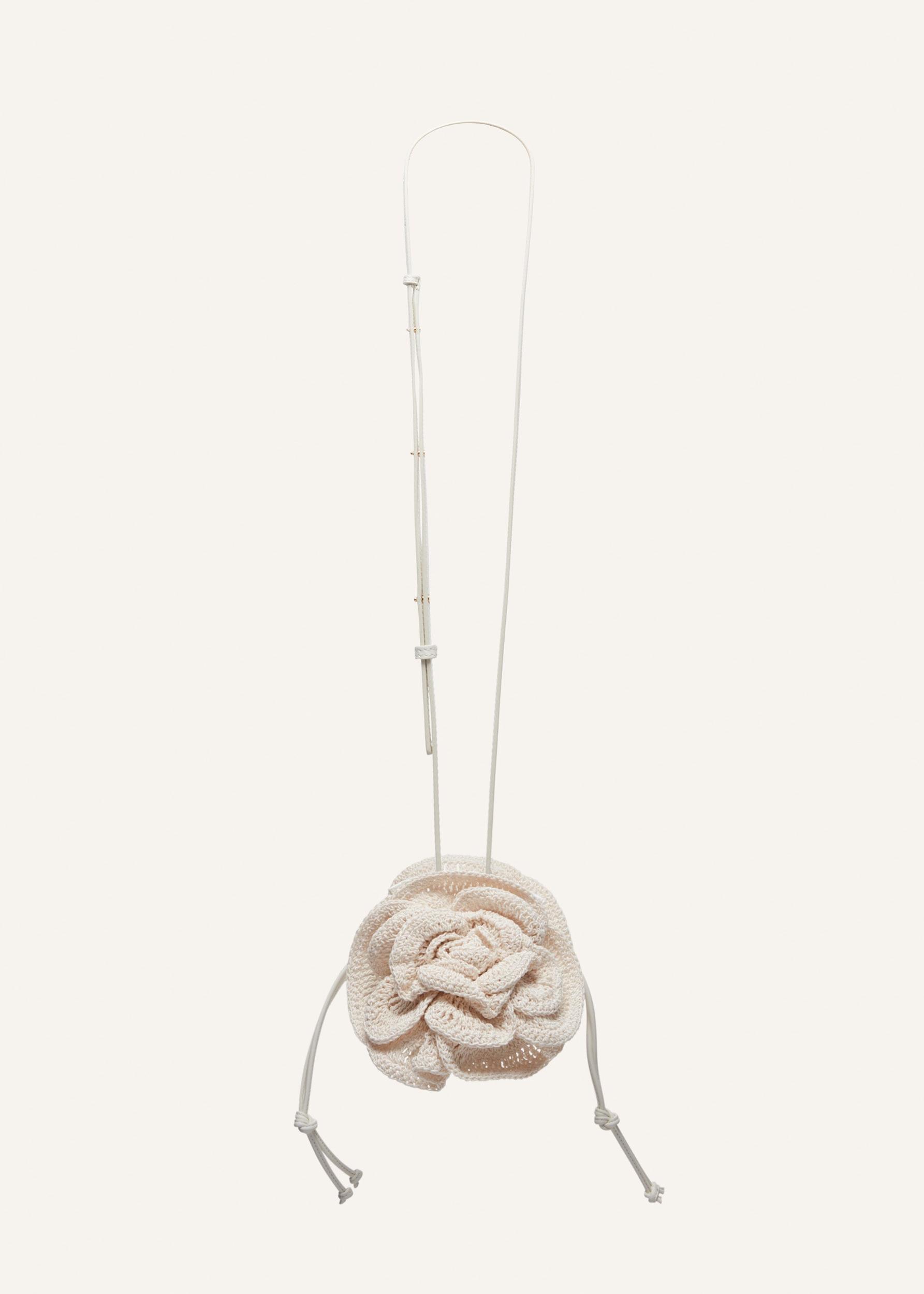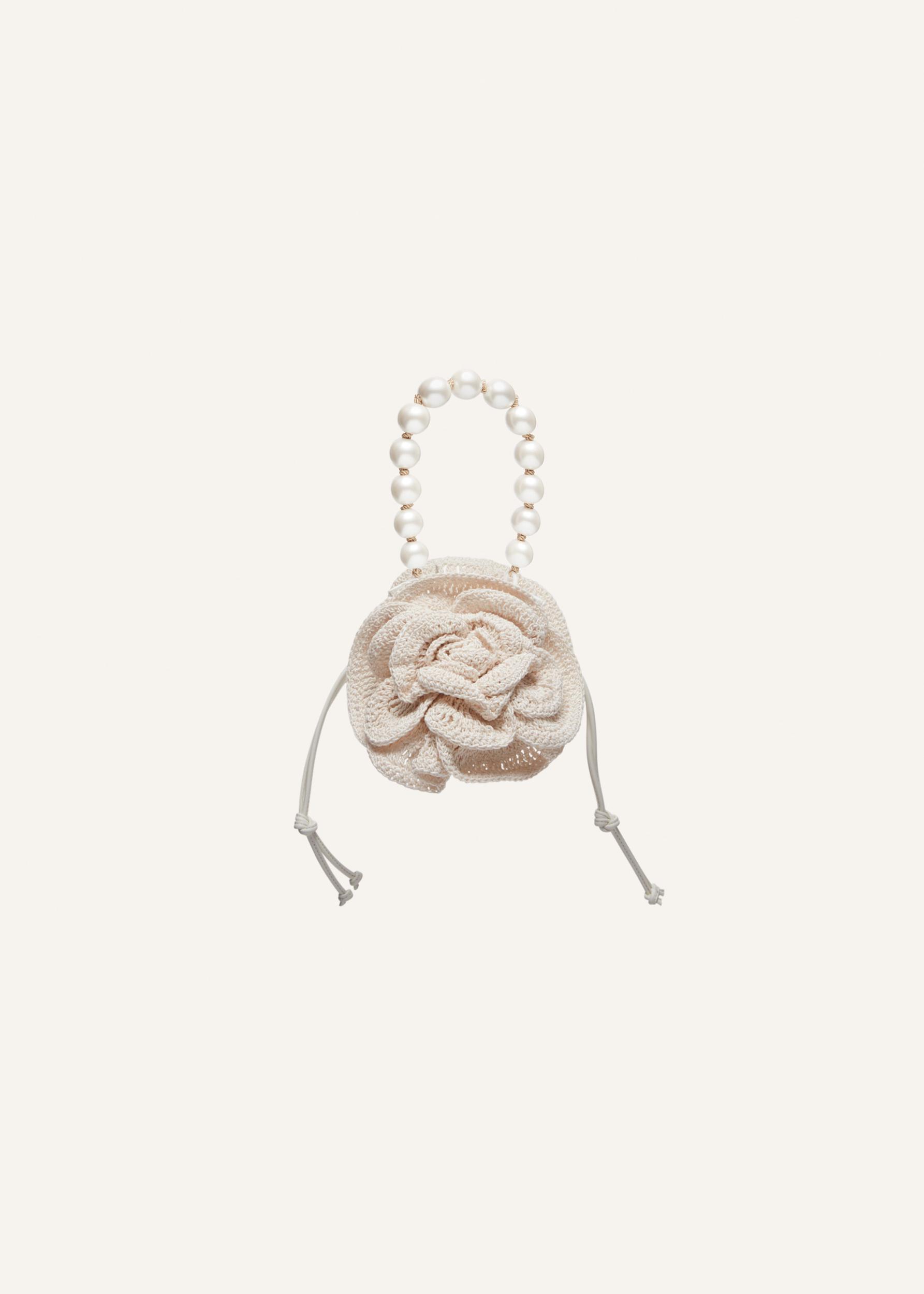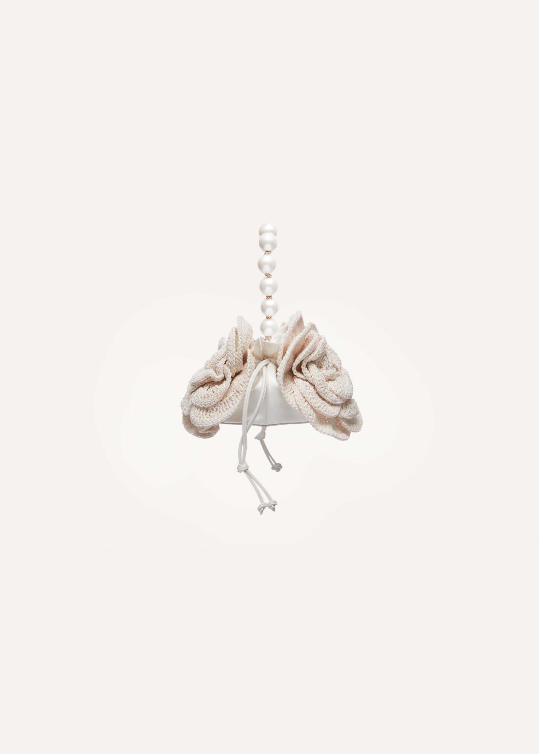 The Magda bag is a mini bucket bag made from satin, adorned with large 3D fabric flowers across the body. Made from crochet, these flowers add a signature element of Magda DNA. Detach the satin strap and carry it by the pearl handle.