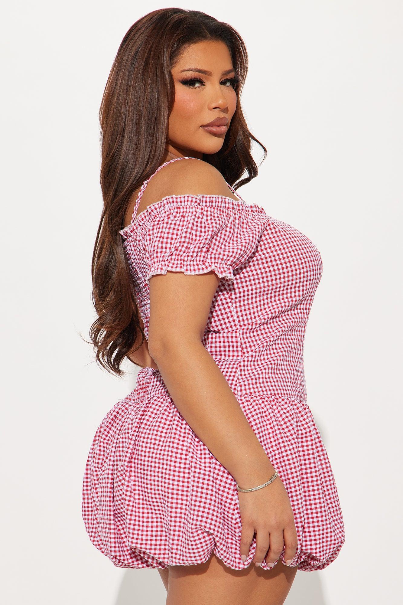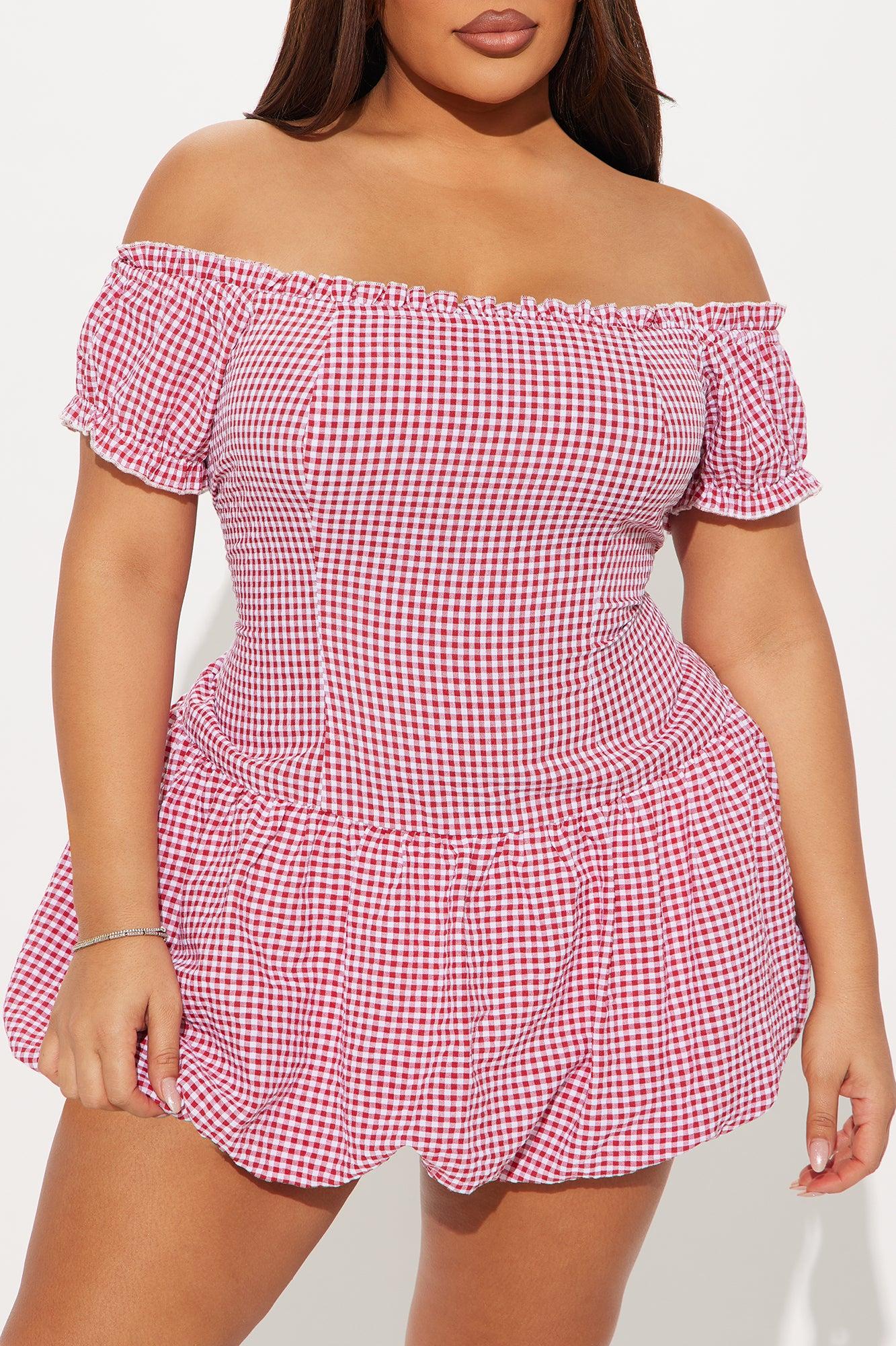 Available In Black/White And Red/White. Gingham Bubble Micro Mini Dress Off shoulder Short puff sleeves Ruffle trim Cold shoulder Bubble hem Smocked back Side zipper Stretch Length = 30" Shell: 50% Cotton 50% Polyester Lining: 100% Polyester Imported