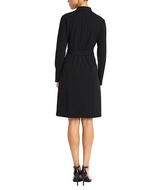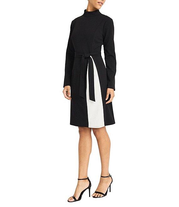 From Maggy London, this dress features: Scuba crepe fabrication A-line silhouette Mock neckline Long sleeves Color block print Self-tie belt Fully lined Straight hemline Center back zipper closure Approx. 38.75" length Polyester/spandex Dry clean Imported.