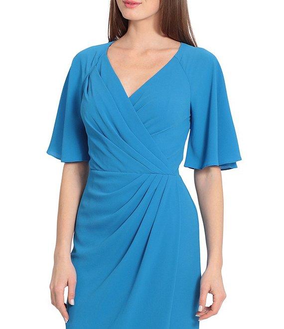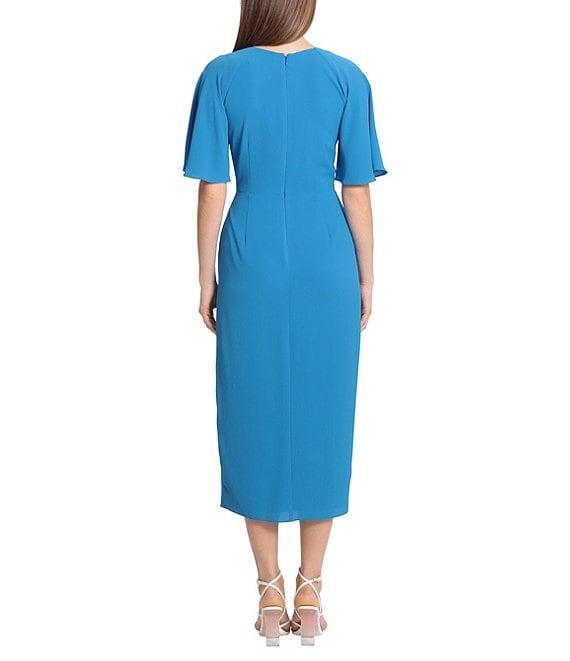 Maggy London Draped Faux Wrap Short Flutter Sleeve Surplice V-Neck Pebble Crepe Midi Dress