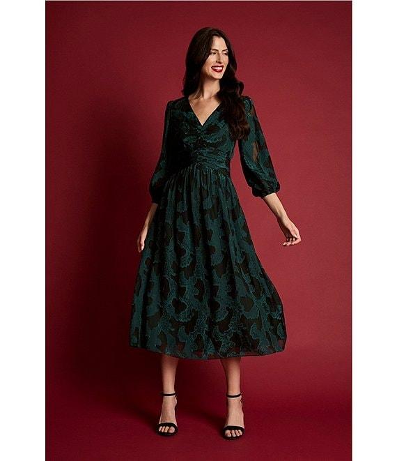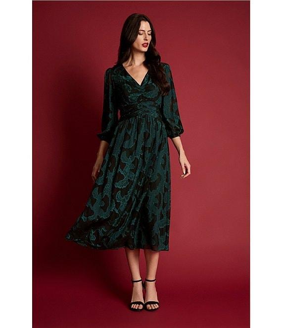 Maggy London Floral Clip Jacquard V-Neck Balloon Long Sleeve Midi Dress
