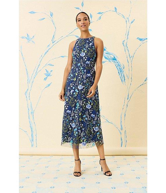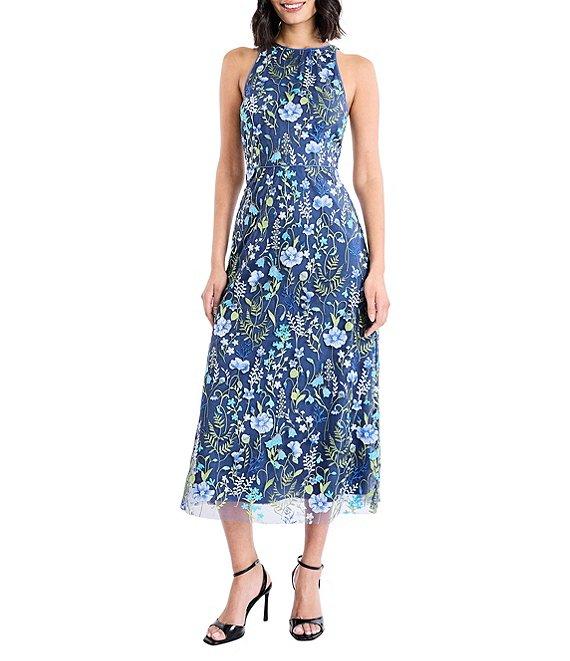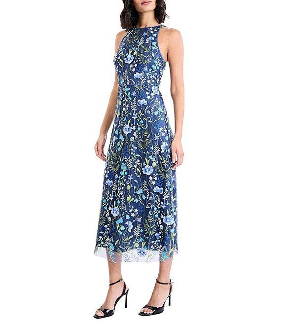 Maggy London Floral Embroidery Halter Neck Sleeveless Plunge Back Detail Midi Dress