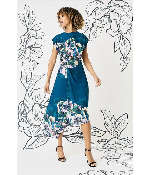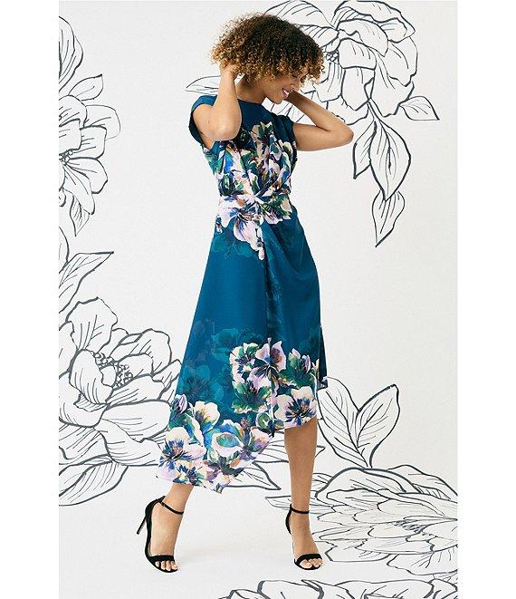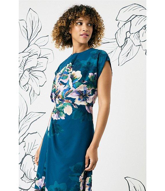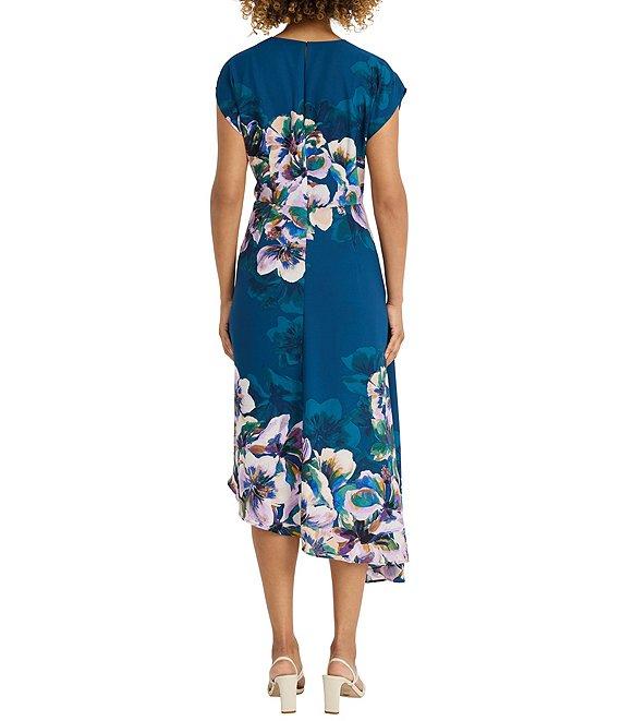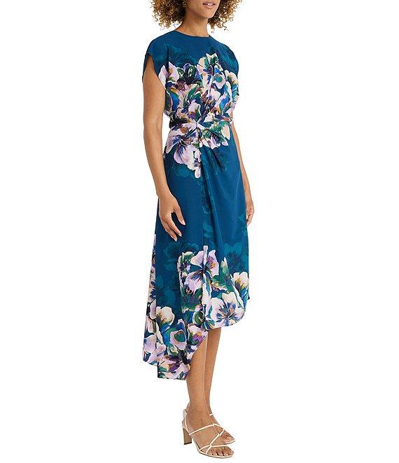 Maggy London Georgette Floral Print Round Neck Cap Sleeve Asymmetrical Hem Blouson Midi Dress