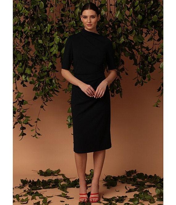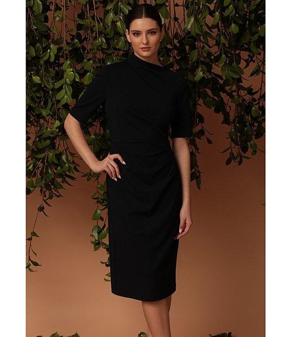 From Maggy London, this dress features: scuba crepe fabricationsheath silhouette mock necklineshort sleevesdraped midi intended to hit below the kneelined center back zip closureapprox. 46" from shoulder to hem polyester/spandexdry cleanImported.