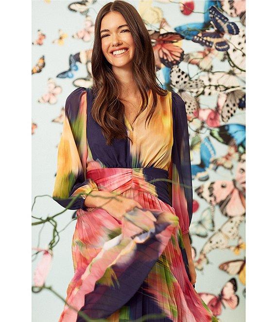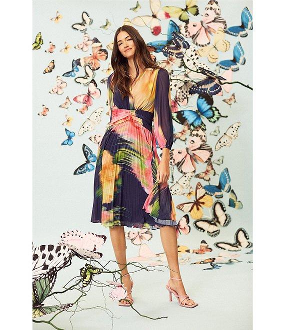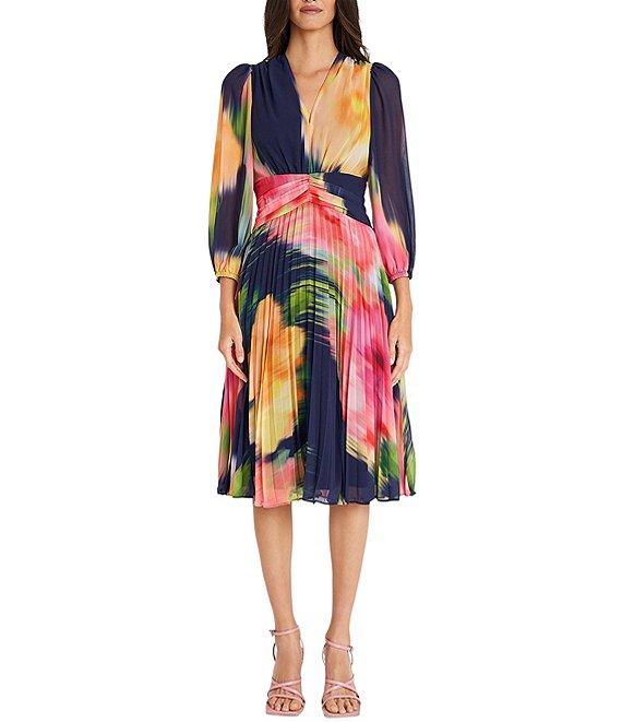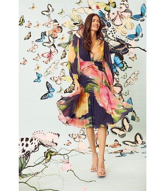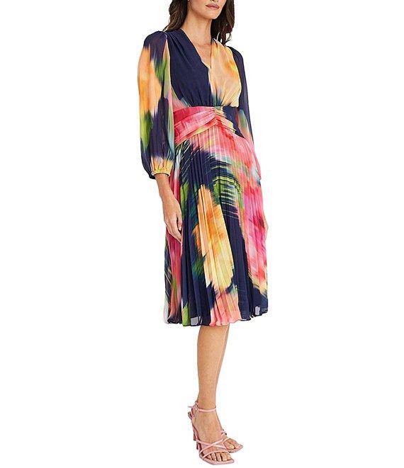 Maggy London Printed Chiffon Pleated V Neckline Long Sleeve Midi Dress