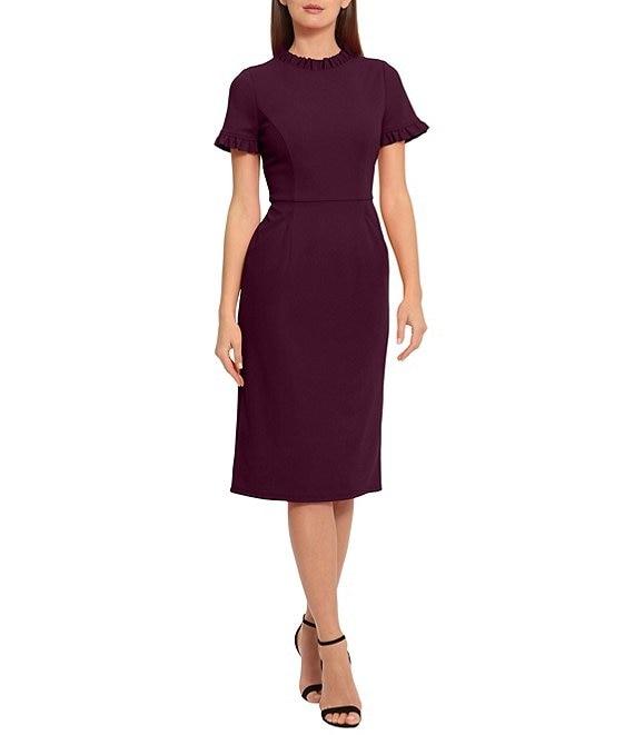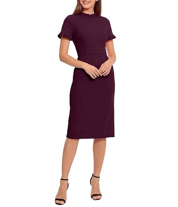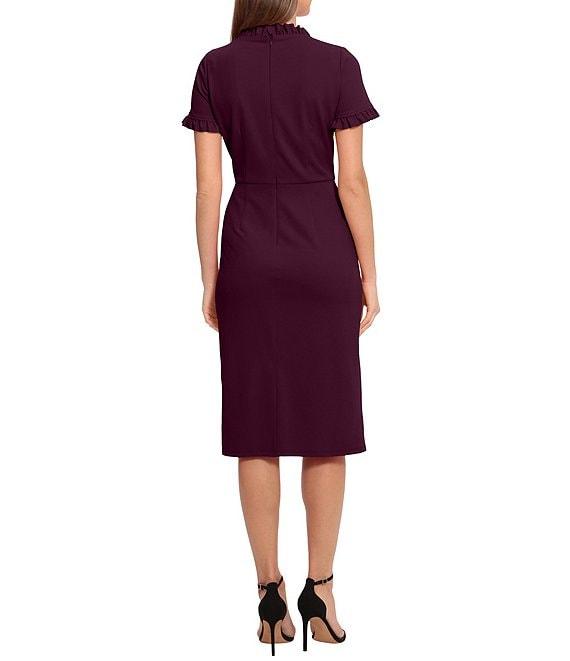 Maggy London Ruffle Mock Neck Short Sleeve Stretch Crepe Midi Pencil Sheath Dress