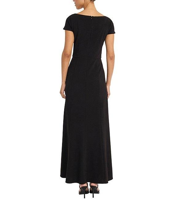 From Maggy London, this dress features: Scuba crepe fabrication Asymmetrical neckline Cap sleeves Lined Embellished neckline A-line silhouette Center back zipper closure Approx. 57.25" in length Polyester/spandex Dry clean Imported.