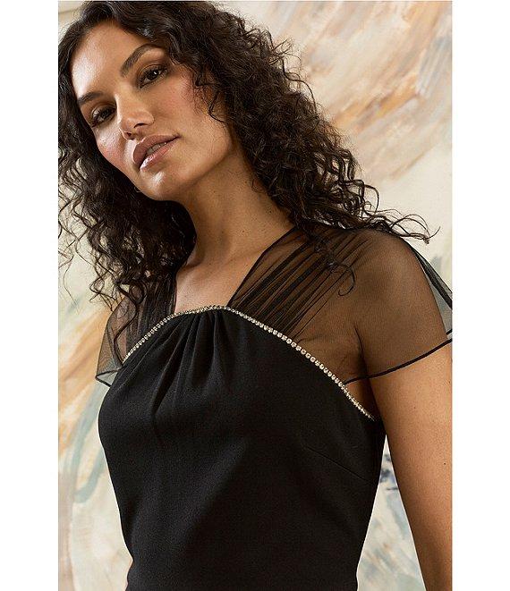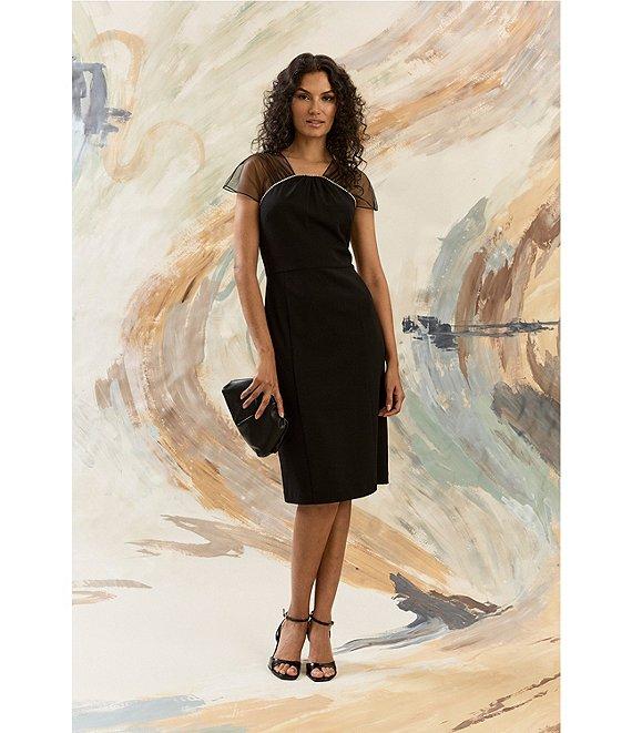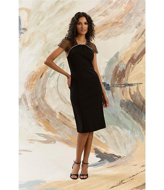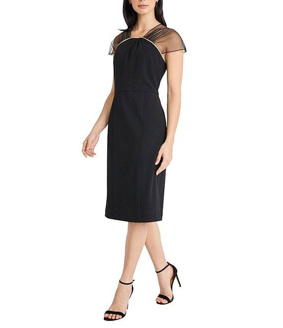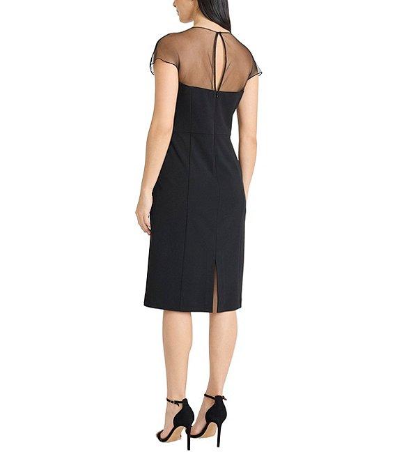 Maggy London Scuba Crepe Mesh Illusion Neck Beaded Neckline Sheath Midi Dress
