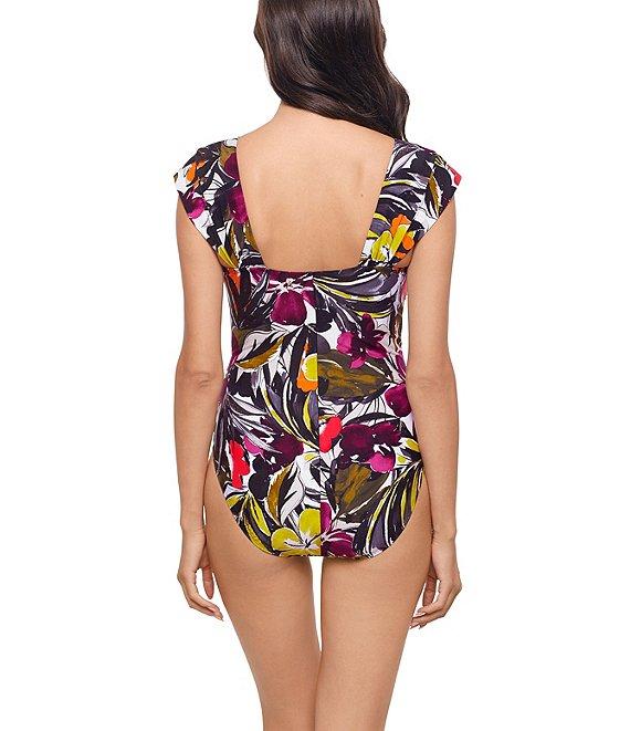 From Magicsuit, this one piece swimsuit features: Bandeau silhouette Sweetheart neckline Shelf bra Caps sleeves can be worn on or off shoulder Shirred bodice conceals tummy Provides allover slimming & shaping Moderate coverage Fully lined Pull-on construction Nylon/spandex Hand wash Imported.