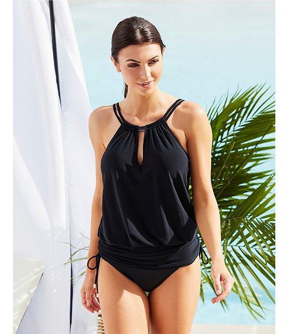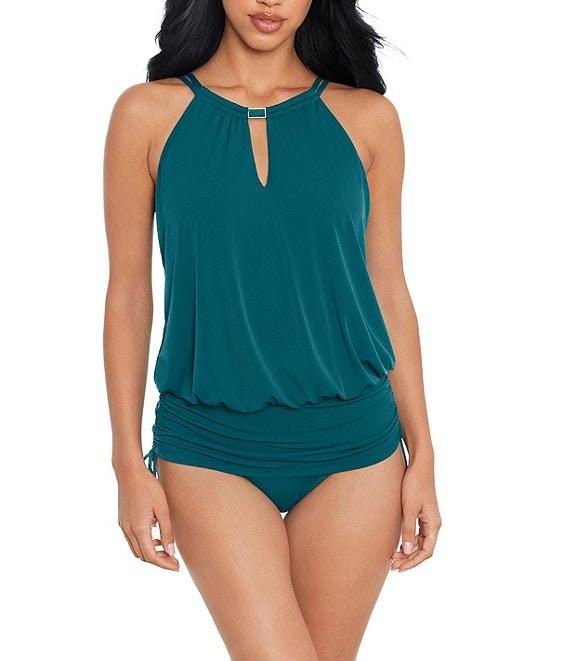 From Magicsuit, this one-piece features: Blouson swim dress Keyhole high neckline Removable soft cups Adjustable over the shoulder straps Underwire Provides allover slimming control to shape and smooth the body Drawstring side ties for adjustable bottom coverage Moderate coverage Lined Pull-on construction Polyester/spandex Hand wash Imported.
