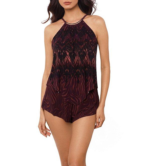 From Magicsuit, this one piece swimsuit features: Romper silhouette High neckline Removable soft cups Underwire Adjustable straps Allover slimming and shaping Full coverage Fully lined Pull-on construction Polyester/spandex Hand wash Imported.