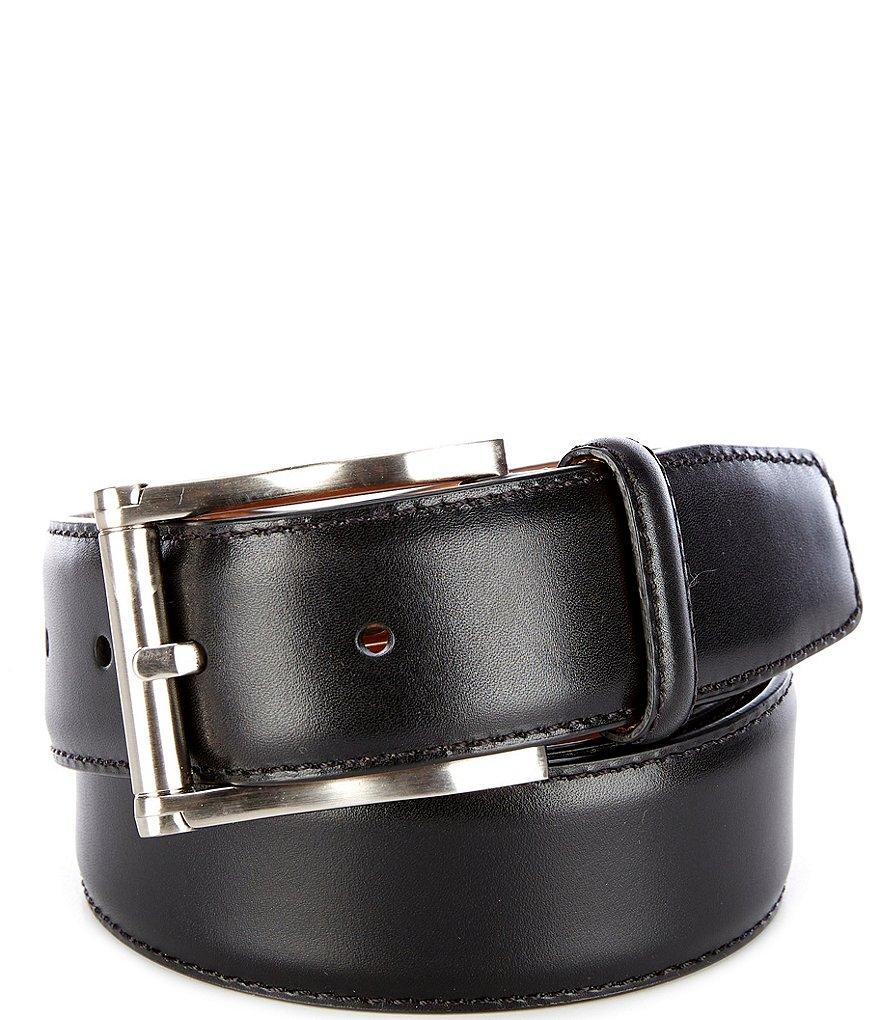 From Magnanni, the Men's Carbon Leather Belt features: Leather approx. 1.25" belt width; 2" x 1.75" buckle Made in Spain Imported. Suggested belt size: Take your existing pants size and add two inches. E.g. if your pants size is 32, purchase a size 34.