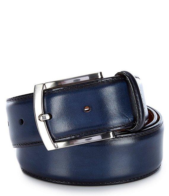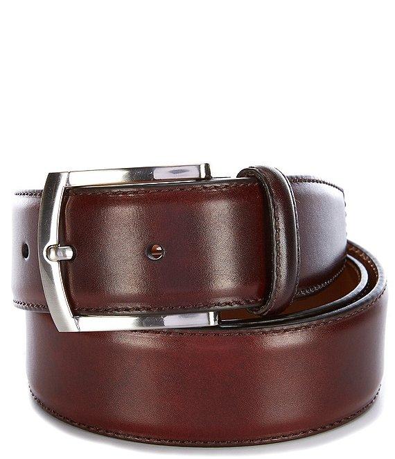 From Magnanni, the Men's Tanner Calfskin Leather Belt features: crafted from a hand-finished calfskin leather Metal buckle in a silver finish Single prong and loop buckle approx. 1.25" width Made in Spain Imported. Suggested belt size: Take your existing pants size and add two inches. E.g. if your pants size is 32, purchase a size 34.