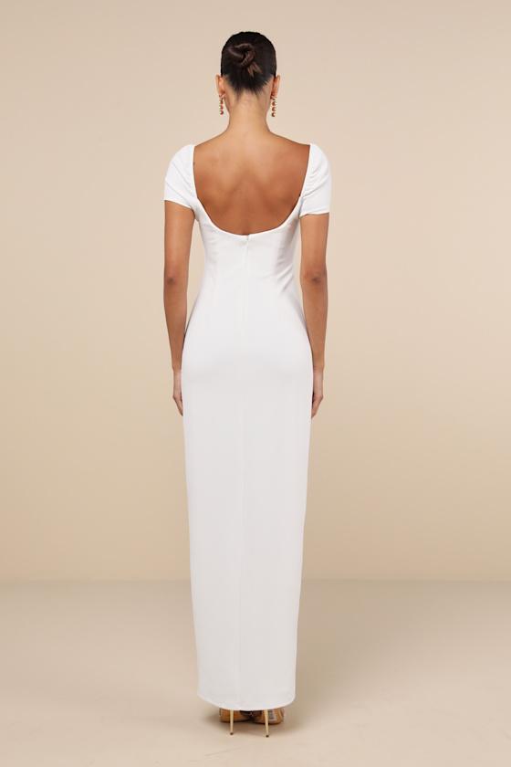 No one will forget how gorgeous you look in the Lulus Magnificent Impression White Square Neck Short Sleeve Maxi Dress! Make a chic statement in this stretchy techno crepe dress with a flattering square neckline (with hidden no-slip strips) and a seamed bodice, framed by short sleeves with elasticized shoulders. The figure-skimming silhouette continues into a column maxi skirt with a sultry side slit. An alluring scoop back completes the look. Hidden back zipper/clasp.