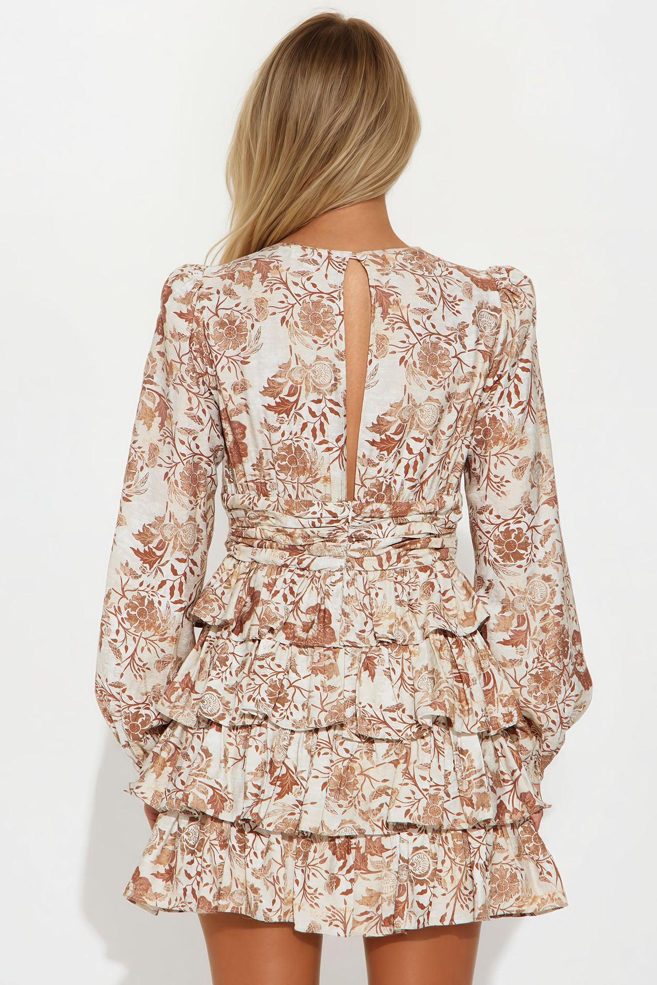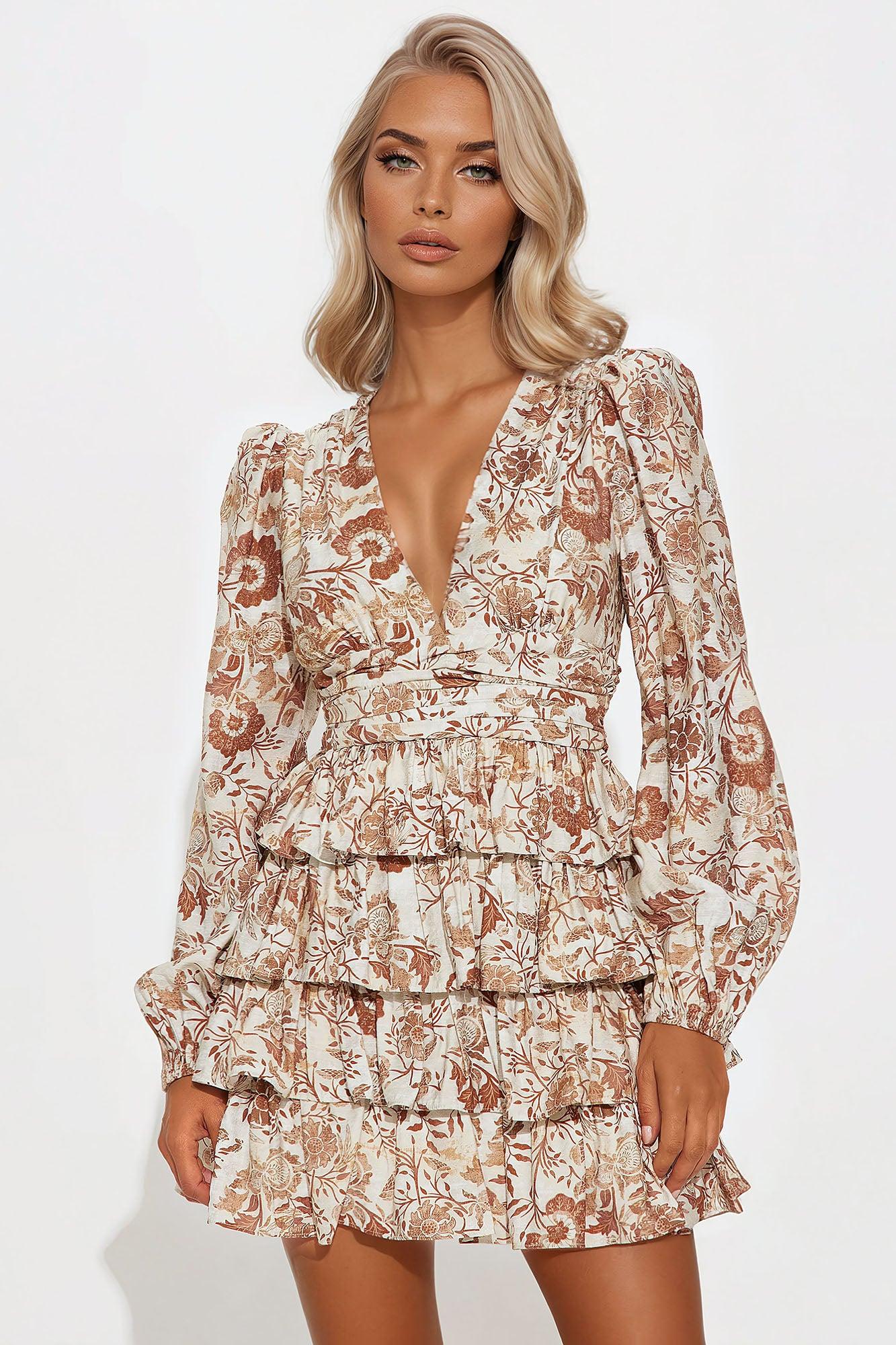 Available In Beige/Brown. Floral Linen Mini Dress Deep v-neck Long puff sleeve Ruched Tiered hem Cut out Back zipper Lined Length = 32" Disclaimer: Print Placement May Vary Self: 85% Rayon 15% Nylon Lining: 100% Polyester Imported