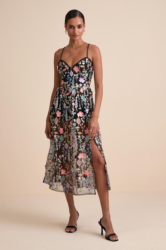 Mahryn Black 3D Floral Embroidered Midi Bodysuit Dress Product Image