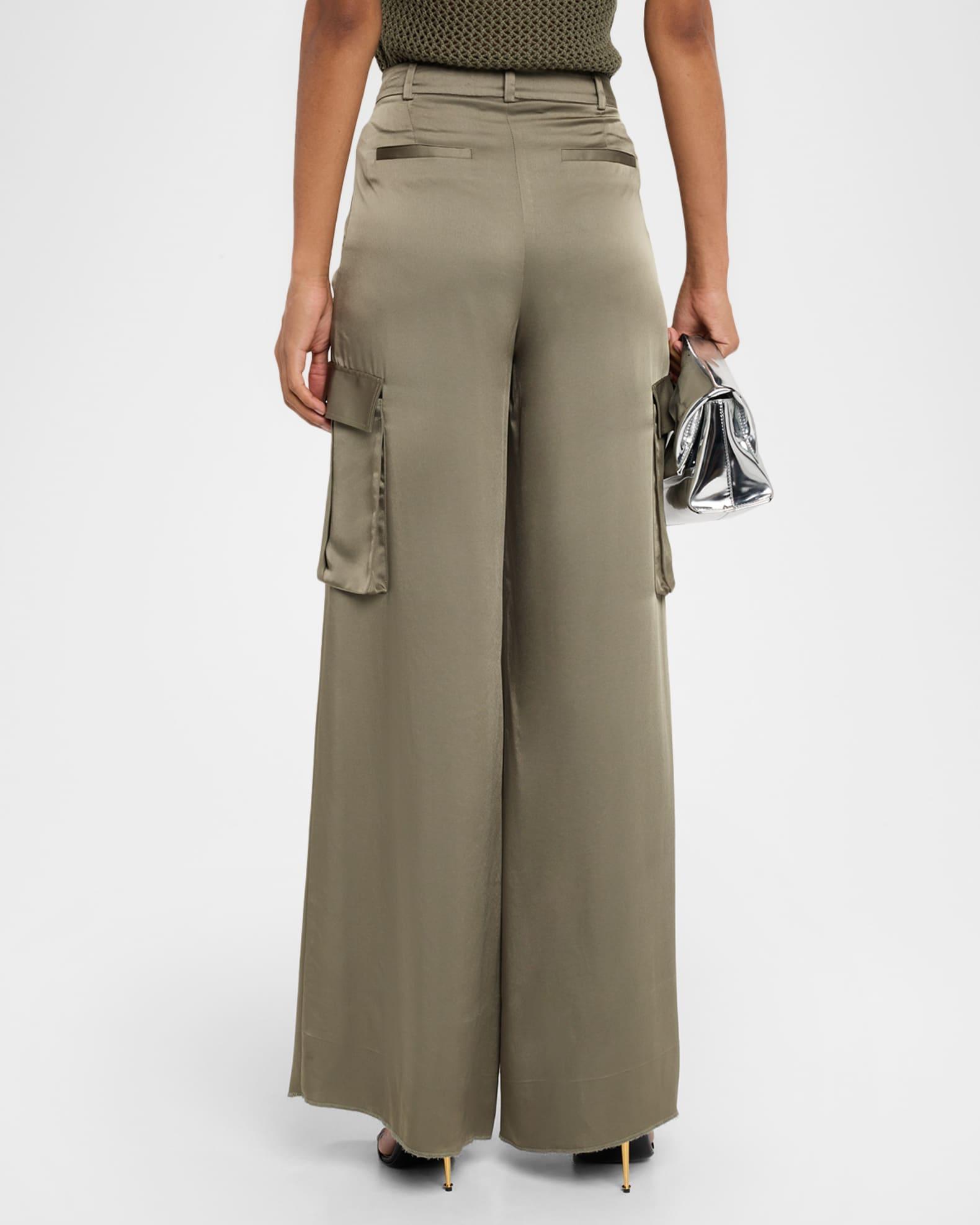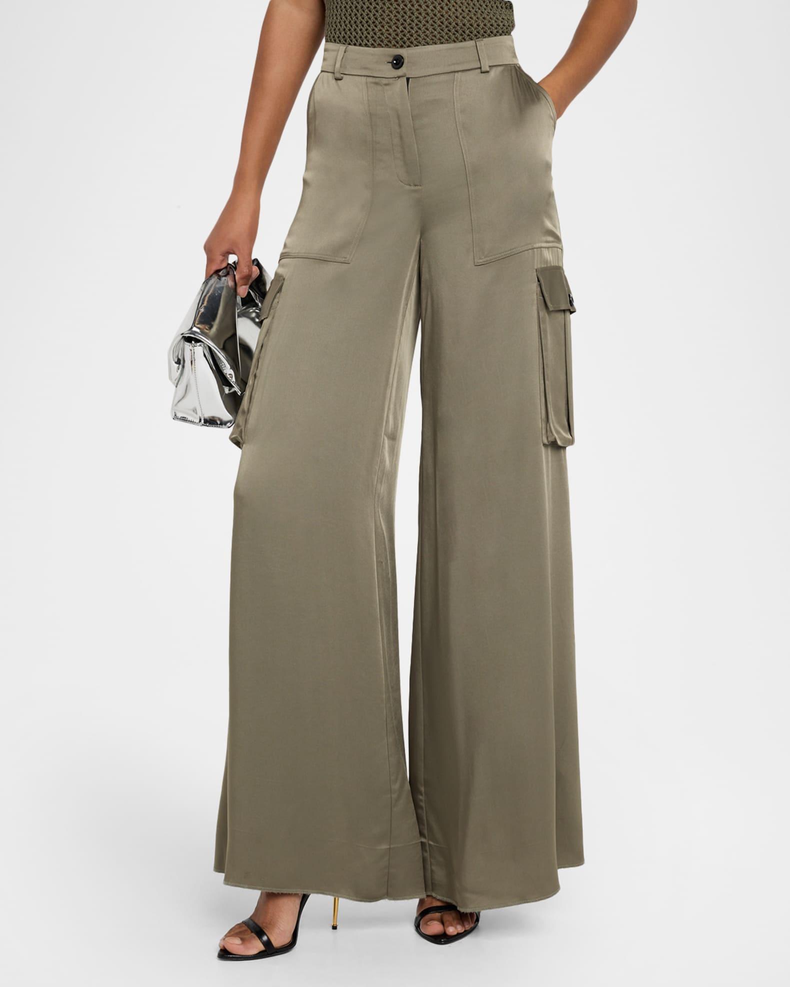 Toccin "Maia" fluid cargo-style pants cut from lustrous silky satin Approx. 32" inseam Mid rise sits high on hip Front patch pockets and back welt pockets Functional leg cargo pockets Full length Wide legs Button/zip fly; belt loops Acetate/polyester Lining: Polyester Hand wash or dry clean Imported