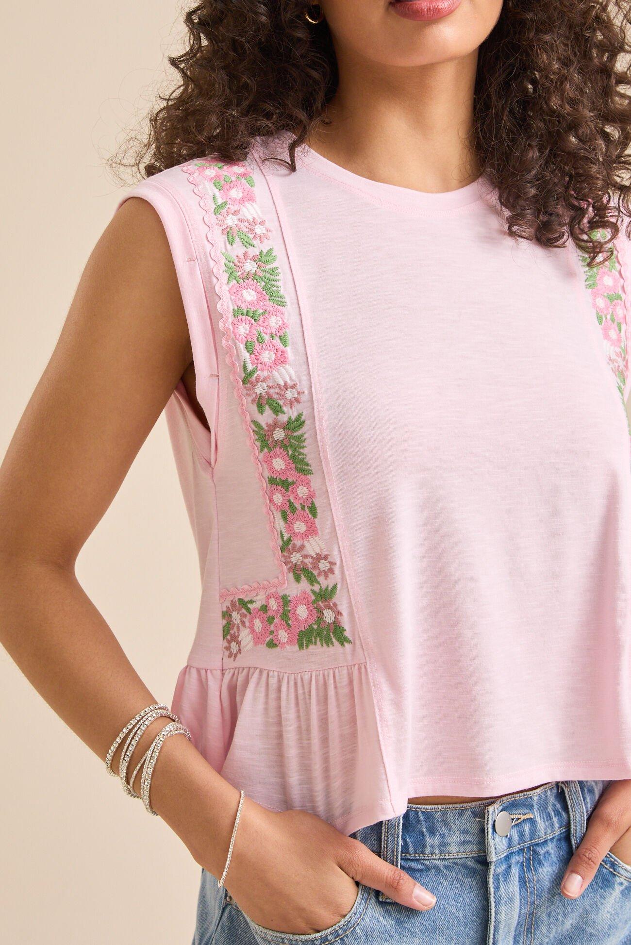 This sweet top is made from a soft, breathable slub knit fabric and offers a relaxed fit with a subtle texture. The standout feature is the intricate embroidered floral paneling along the sides, adding a touch of romance and charm.