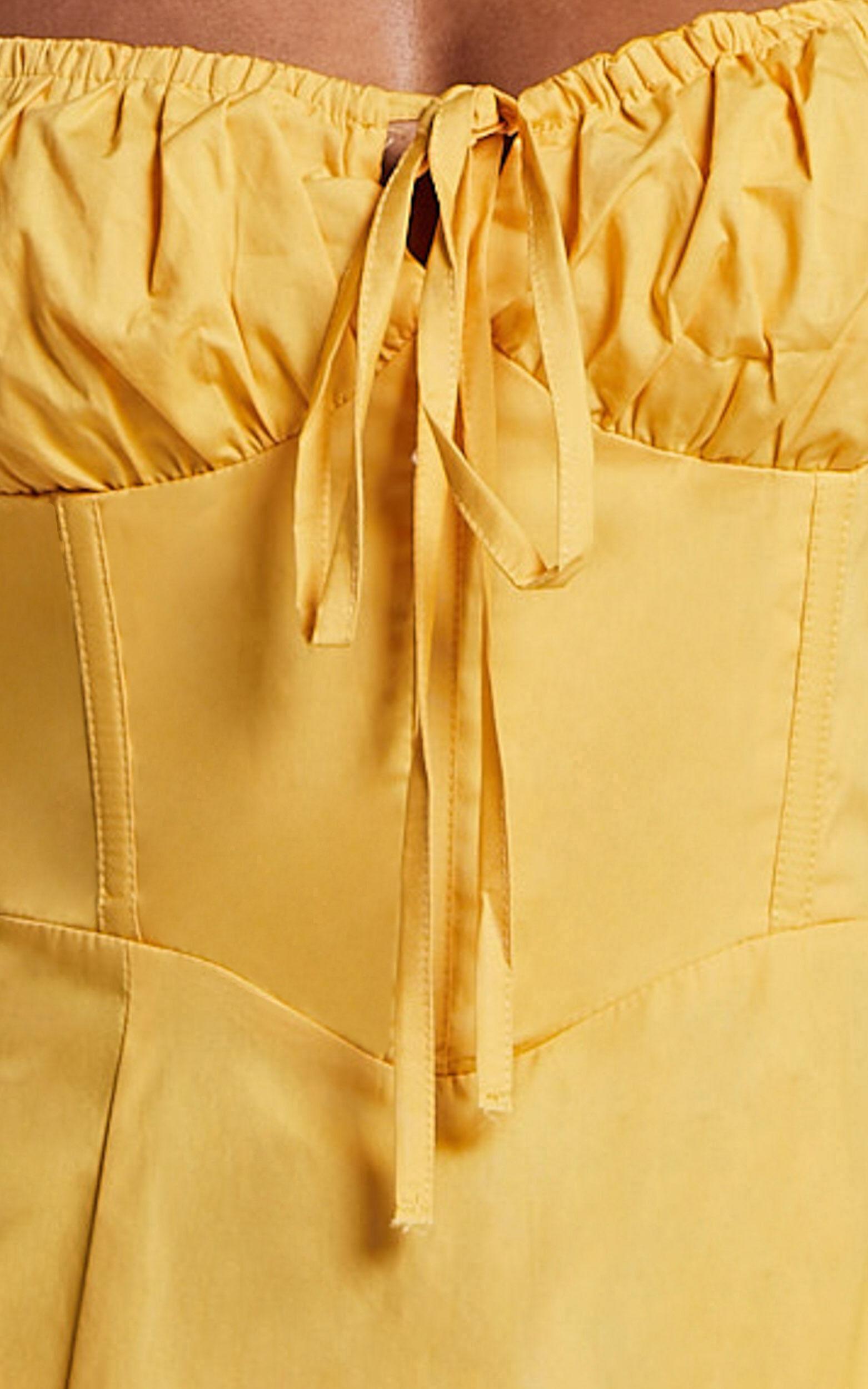 Get ready to turn heads in the Maiya Midi Dress - Tie Front Fitted Bodice Dress In Pineapple! This vibrant yellow dress is perfect for all your party day festivities. With its sweetheart neckline and fitted bodice, it flatters your figure and accentuates your curves in all the right places. Made from soft cotton fabric, this sleeveless midi dress offers both comfort and style. Whether you're attending a summer wedding or going out for brunch with friends, this fit-and-flare dress will make you feel confident and empowered. Add a touch of sweetness to your wardrobe with the Maiya Midi Dress - Tie Front Fitted Bodice Dress In Pineapple!Product Details:Fit & Flare DressSweetheart necklineMidi lengthSleeveless styleCotton fabricZips for closurePerfect for party day occasionsSize and FitSize S / 8 length: 113cm / 44.49inMaterial and CareMain Fabric: 100% Cotton Lining: 100% CottonNo StretchNatural FibresThe main fabric of this product is made from 100% Natural Fibres. Whilst some of these fibres still have detrimental impacts in their supply chain, Natural Fibres have a reduced overall impact compared to a raw polyester.