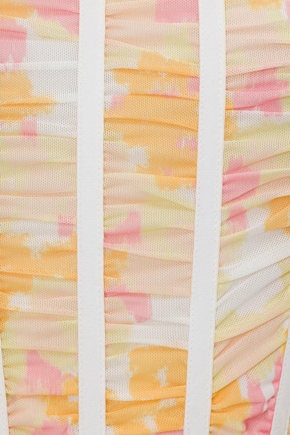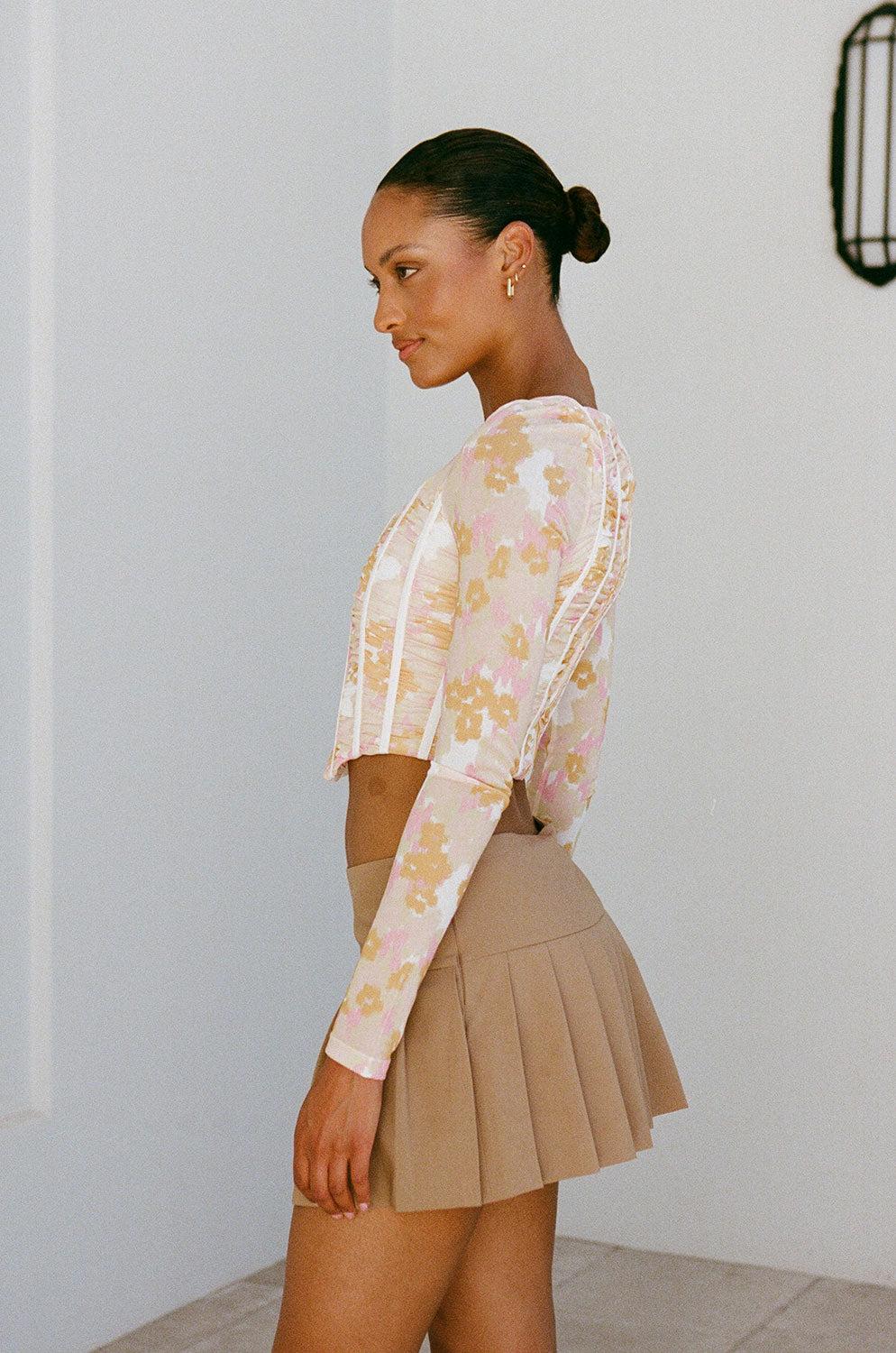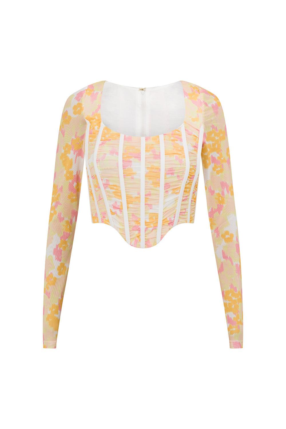 *THIS IS A FINAL SALE ITEM and cannot be returned. See our Returns Policy here The perfect pair to your jeans, the Majella Corset Top is made from a luxurious power mesh fabric with our exclusive smudge ditzy print. It features sheer fitted full length sleeves, rounded neckline and fully lined bodice with contrast boning and a curved hem. Designed exclusively by Sabo.