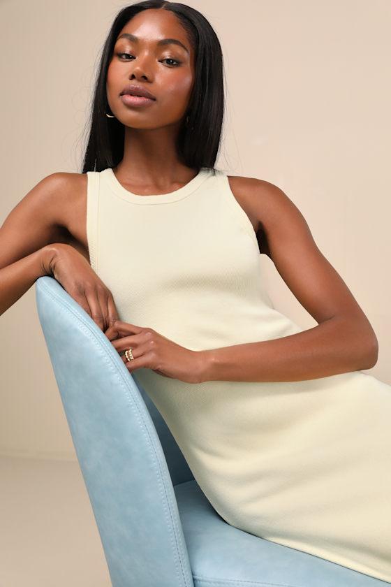 The Lulus Majorly Trendy Light Yellow Ribbed Bodycon Midi Dress is the perfect piece to take you through the trends! Stretchy ribbed knit creates a crew neckline, a sleeveless bodice, and a bodycon silhouette. Figure-skimming skirt continues to a midi hem, perfect for pairing with a chunky boot!