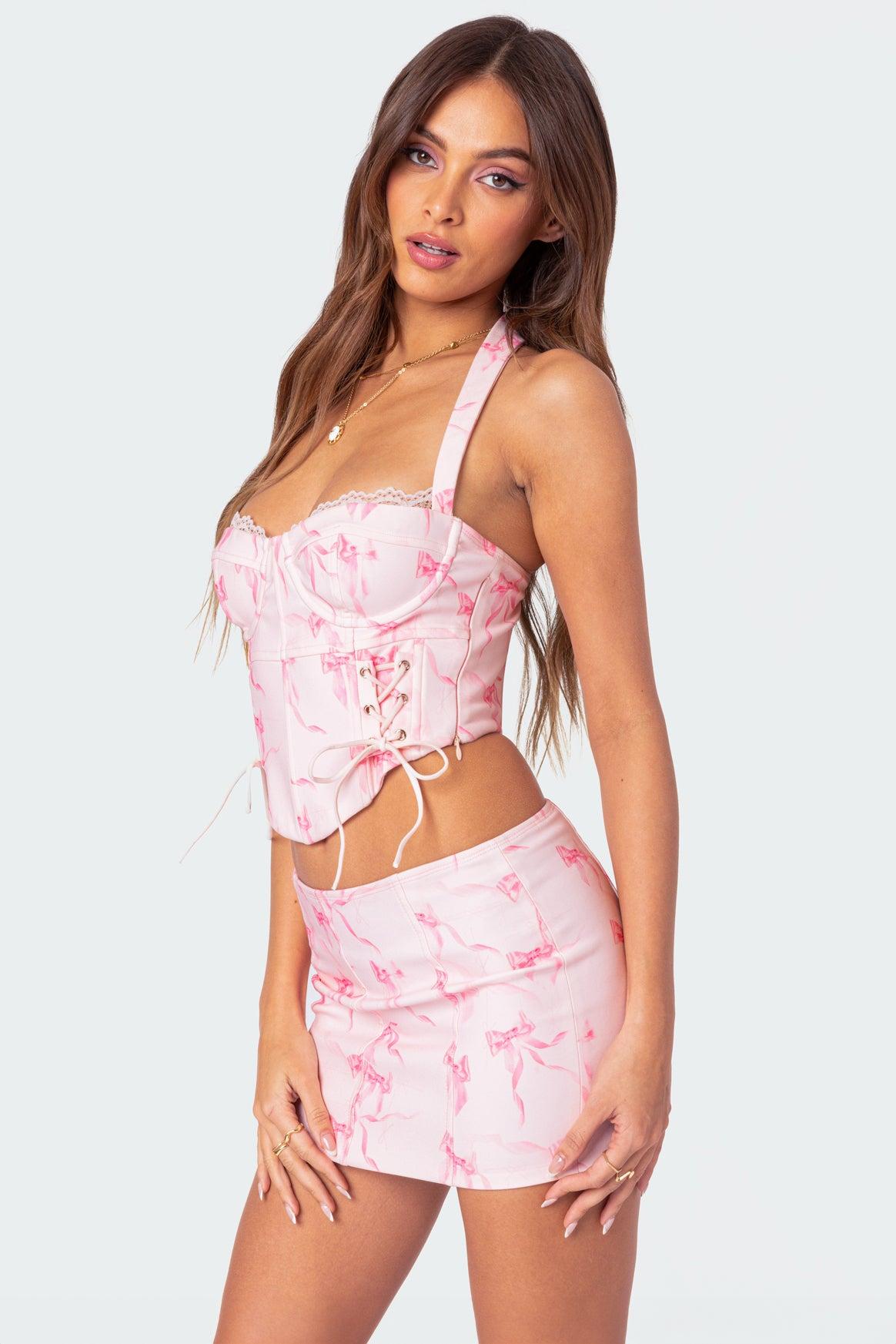 Corset Cupped construction Halter snap button neck Boned bodice Side lace up detailing Ribbon printed fabric Matching set Polyester, Spandex Model wears size S Model height is 5'9 Item care: Wash with similar color