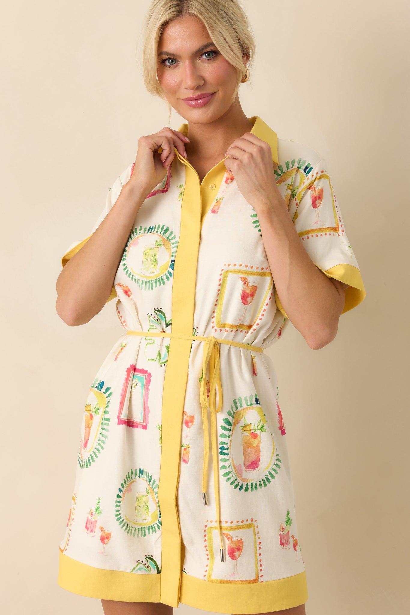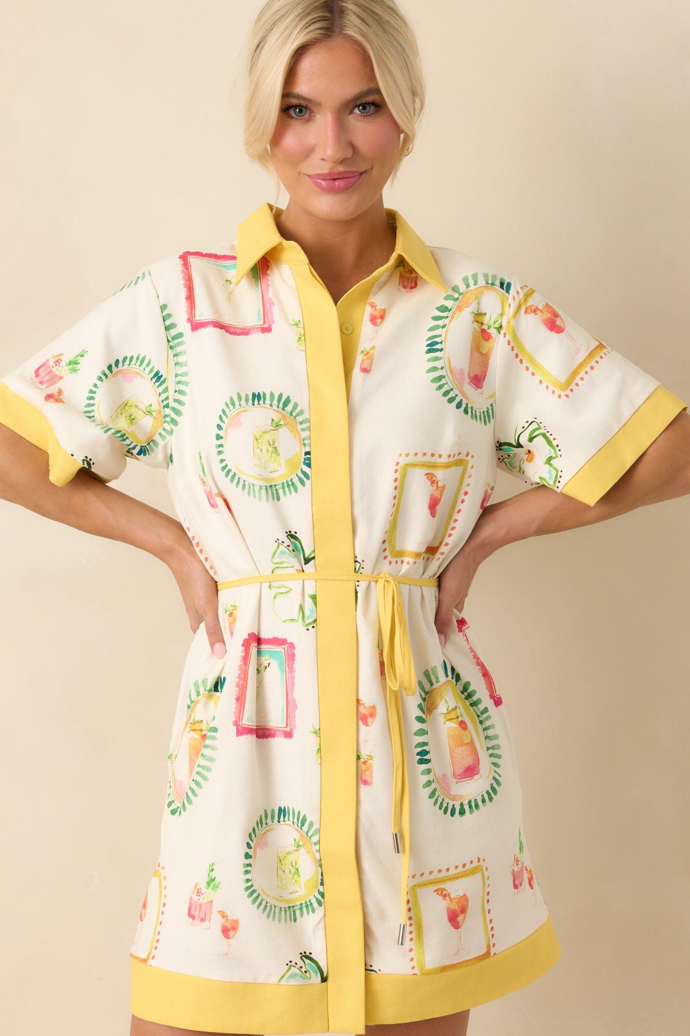 The Make It My Own Ivory Watercolor Cocktail Print Linen Blend Mini Dress is all about having fun your way. Lighthearted and playful, it’s perfect for plans that don’t need a reason—just good vibes and a little personality. This ivory mini dress features a multicolor watercolor cocktail patchwork print, yellow collared neckline, functional button front, yellow covered placket and trim, back box pleats, short sleeves, optional self-tie belt, and functional pockets.