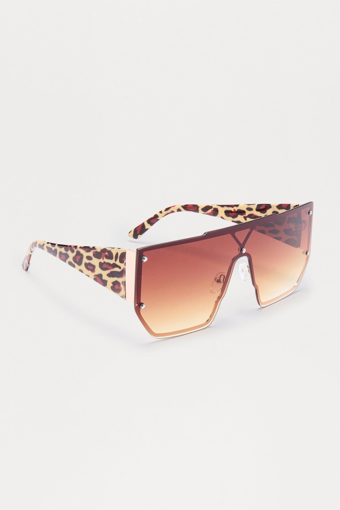 Available In Brown/combo. Shield Frame Standard Lens Leopard Print Temple Design Gold Trim Detail Plastic UV Protection Imported California Proposition 65WARNING: Cancer and Reproductive Harm - www.P65Warnings.ca.gov.