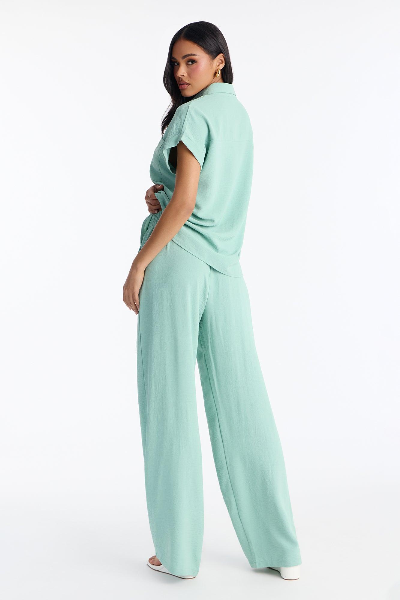 Available In Mocha, Sage And Yellow. 2 Piece Ensemble Collar Top And Wide Leg Pant Set Non-stretch 32.5" Inseam Elastic Waistband Pockets Self: 100% Polyester Imported California Proposition 65WARNING: Cancer and Reproductive Harm - www.P65Warnings.ca.gov.