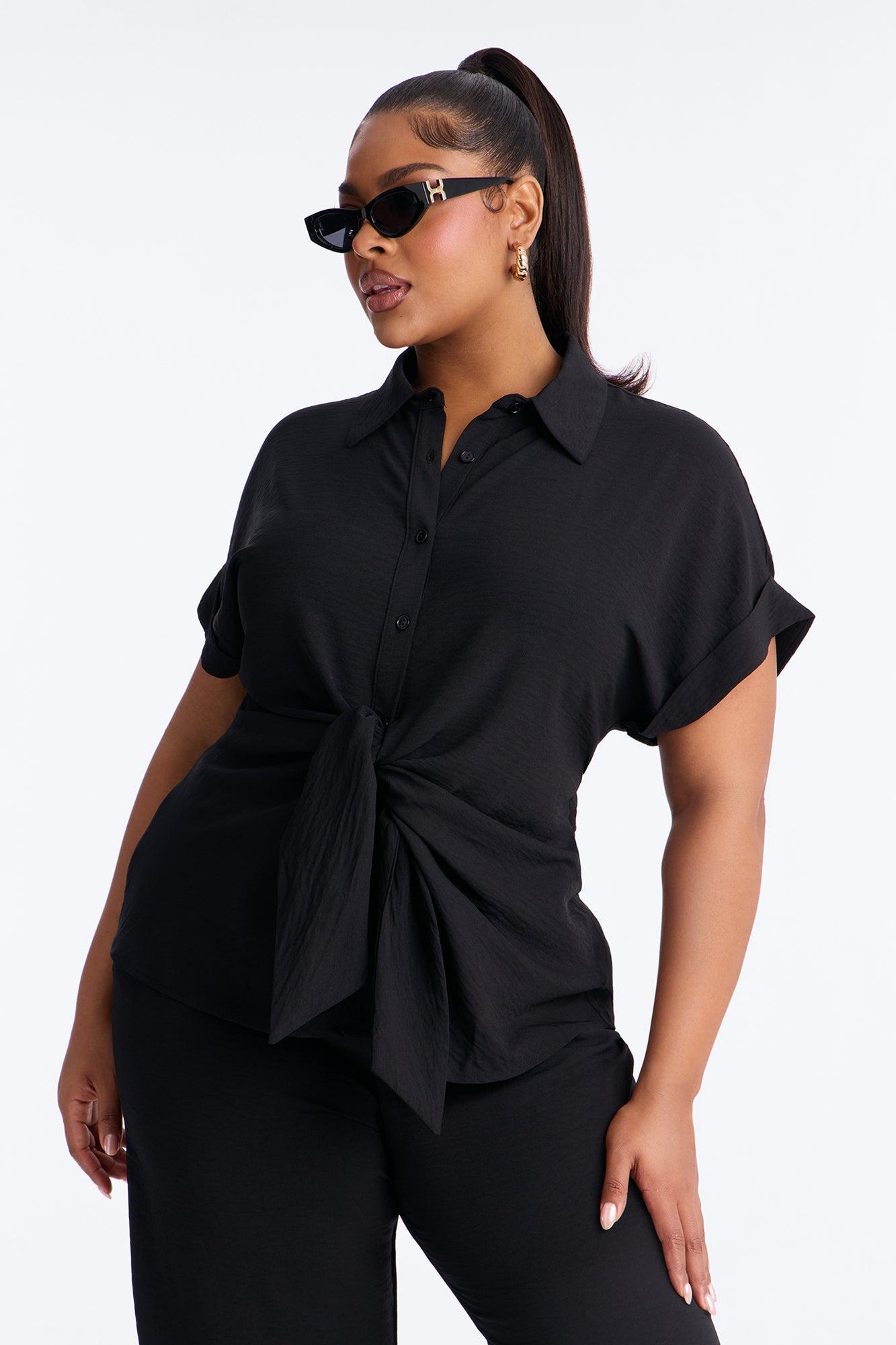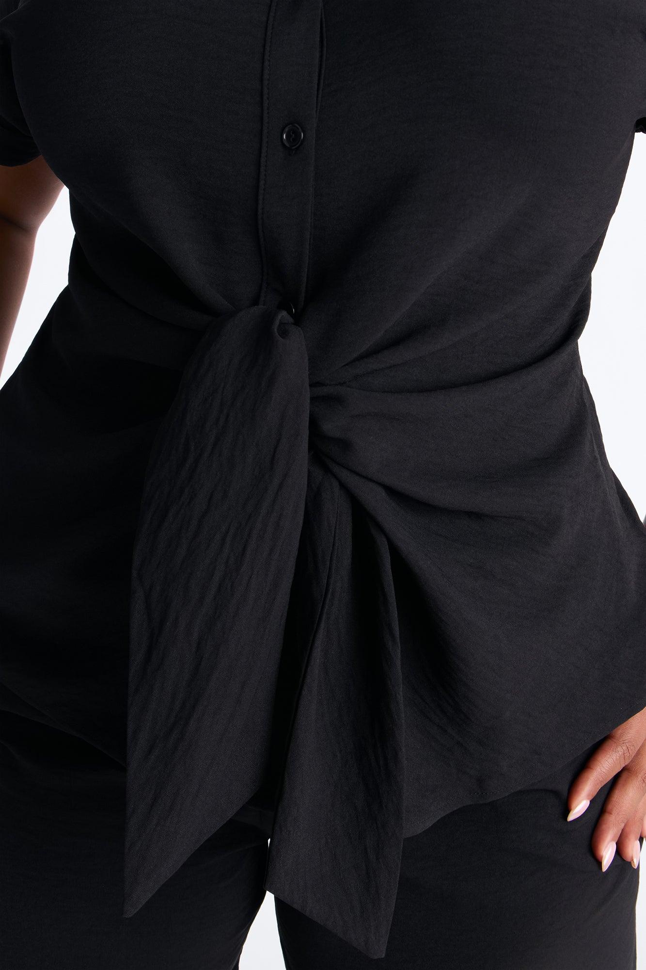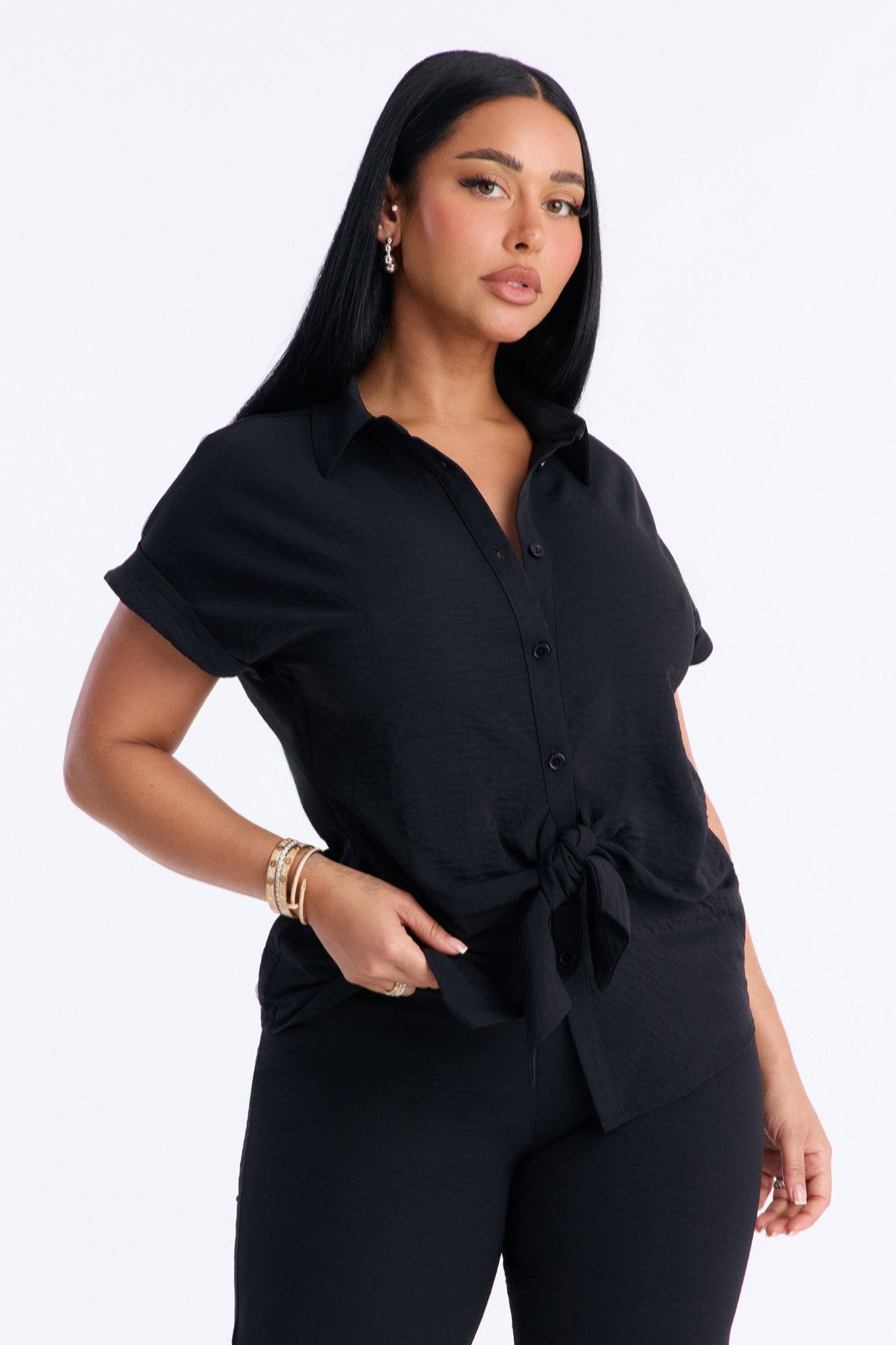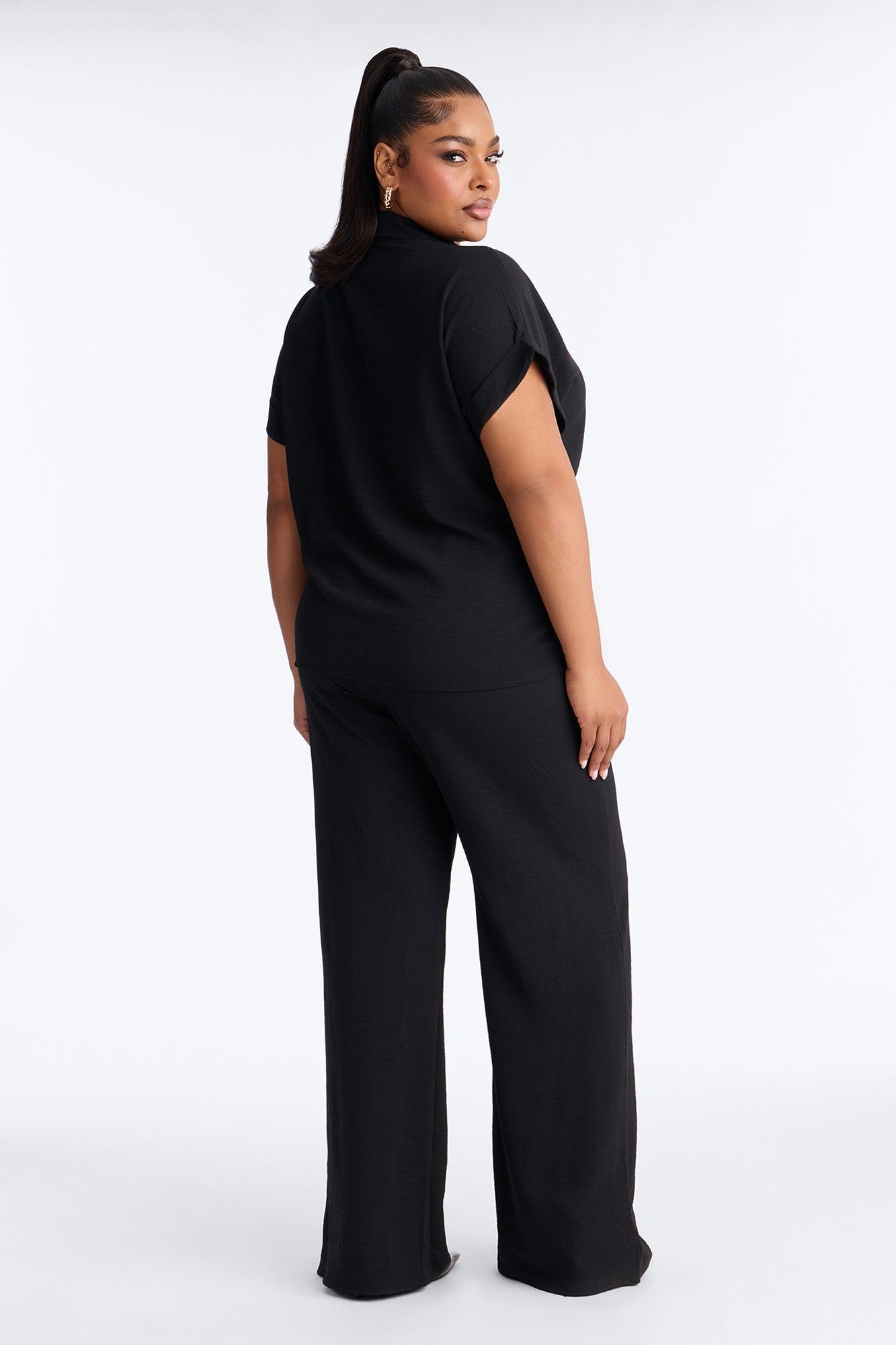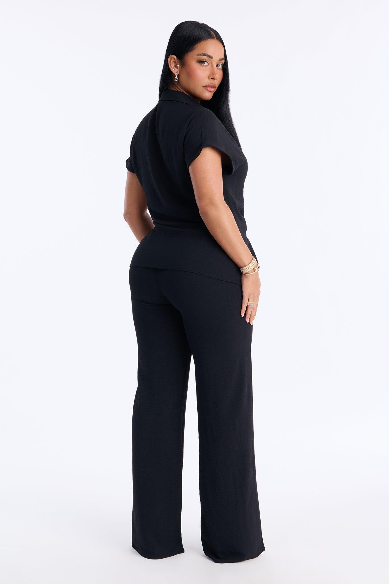 Available In Black, Mocha And Pink. 2 Piece Ensemble Tie Front Top And Wide Leg Pant Set 32" Inseam Elastic Waistband Pockets Self: 100% Polyester Imported California Proposition 65WARNING: Cancer and Reproductive Harm - www.P65Warnings.ca.gov.