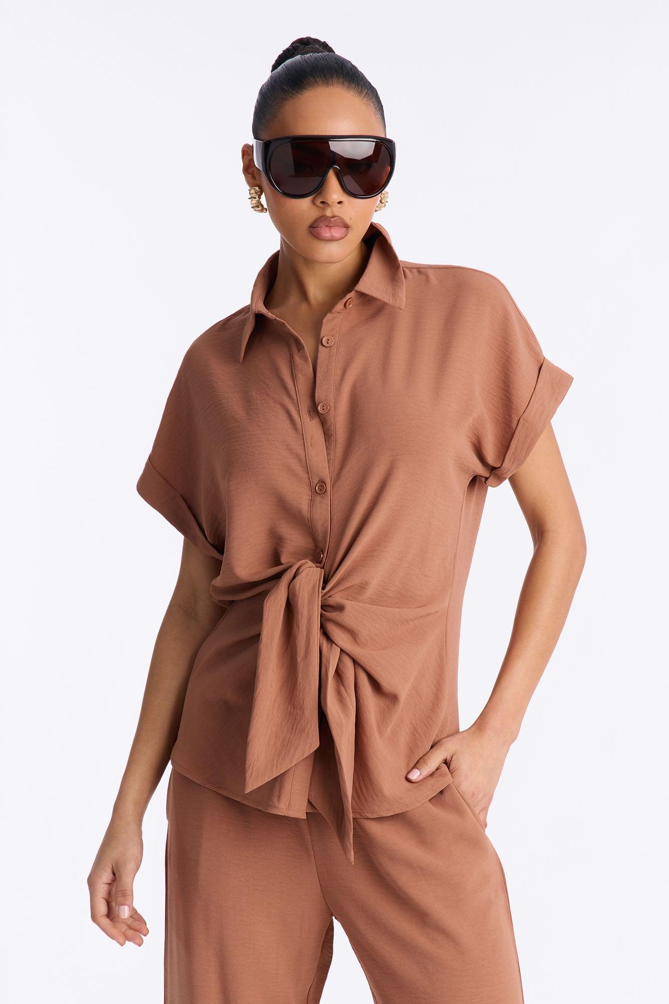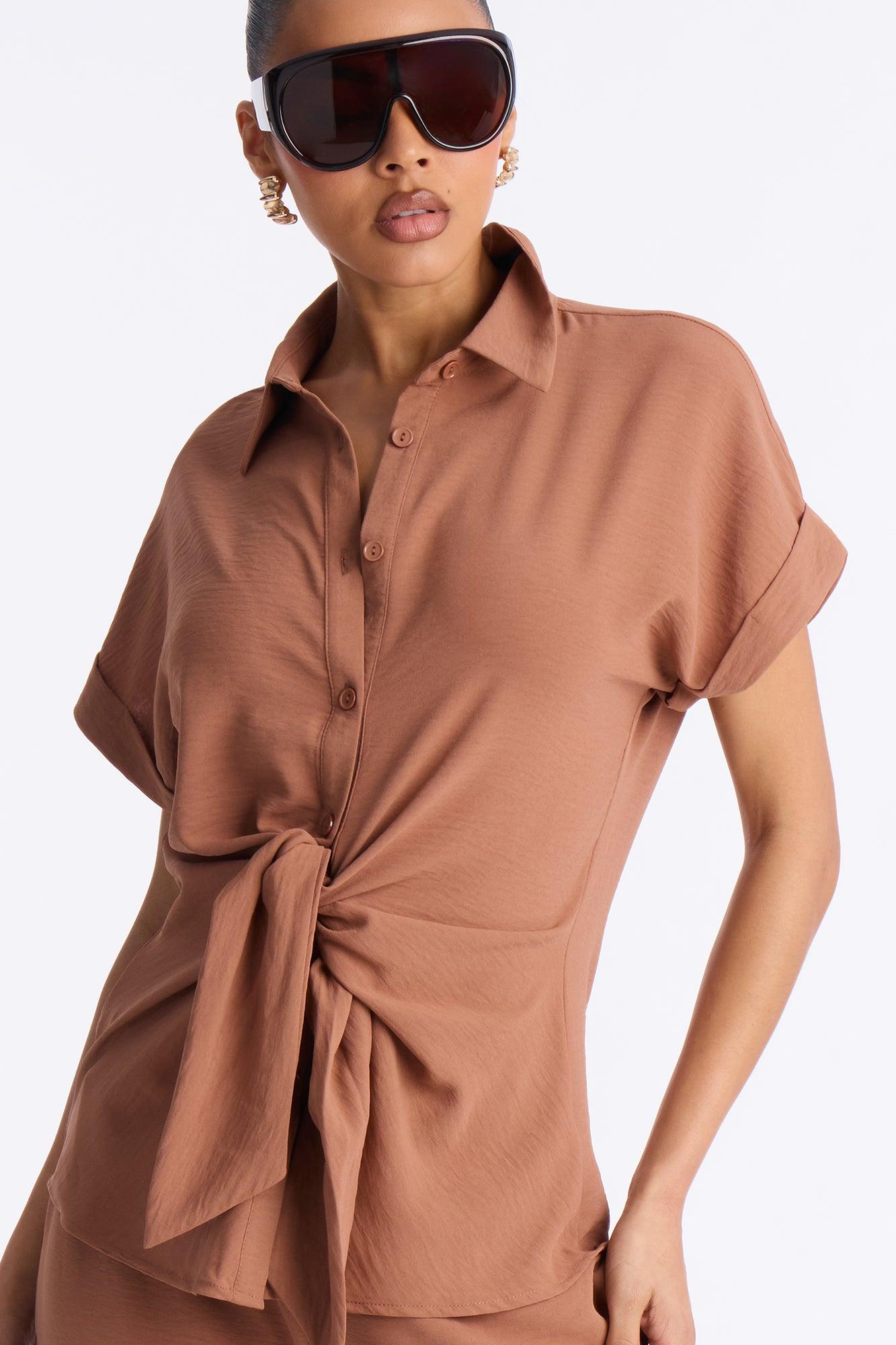 Available In Black, Mocha And Pink. 2 Piece Ensemble Tie Front Top And Wide Leg Pant Set 32" Inseam Elastic Waistband Pockets Self: 100% Polyester Imported California Proposition 65WARNING: Cancer and Reproductive Harm - www.P65Warnings.ca.gov.