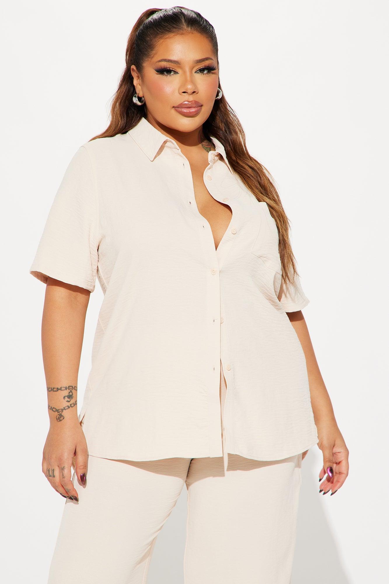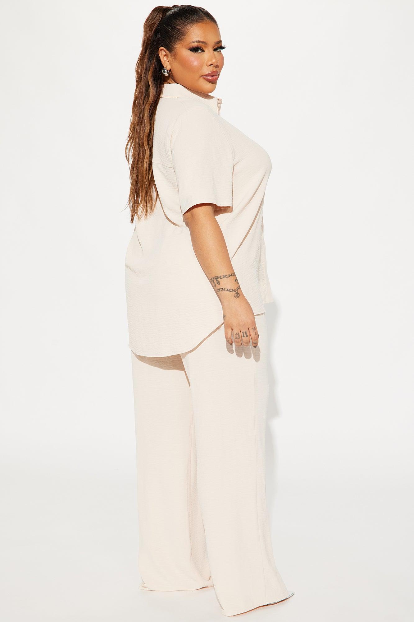 Available In Hot Pink, Turquoise, Orange, And Oatmeal. Pant Set Shirt Collar Short Sleeve Button Up Front Pocket Wide Leg Pant Partial Elastic Waistband Non Stretch 33" Inseam 100% Polyester Imported