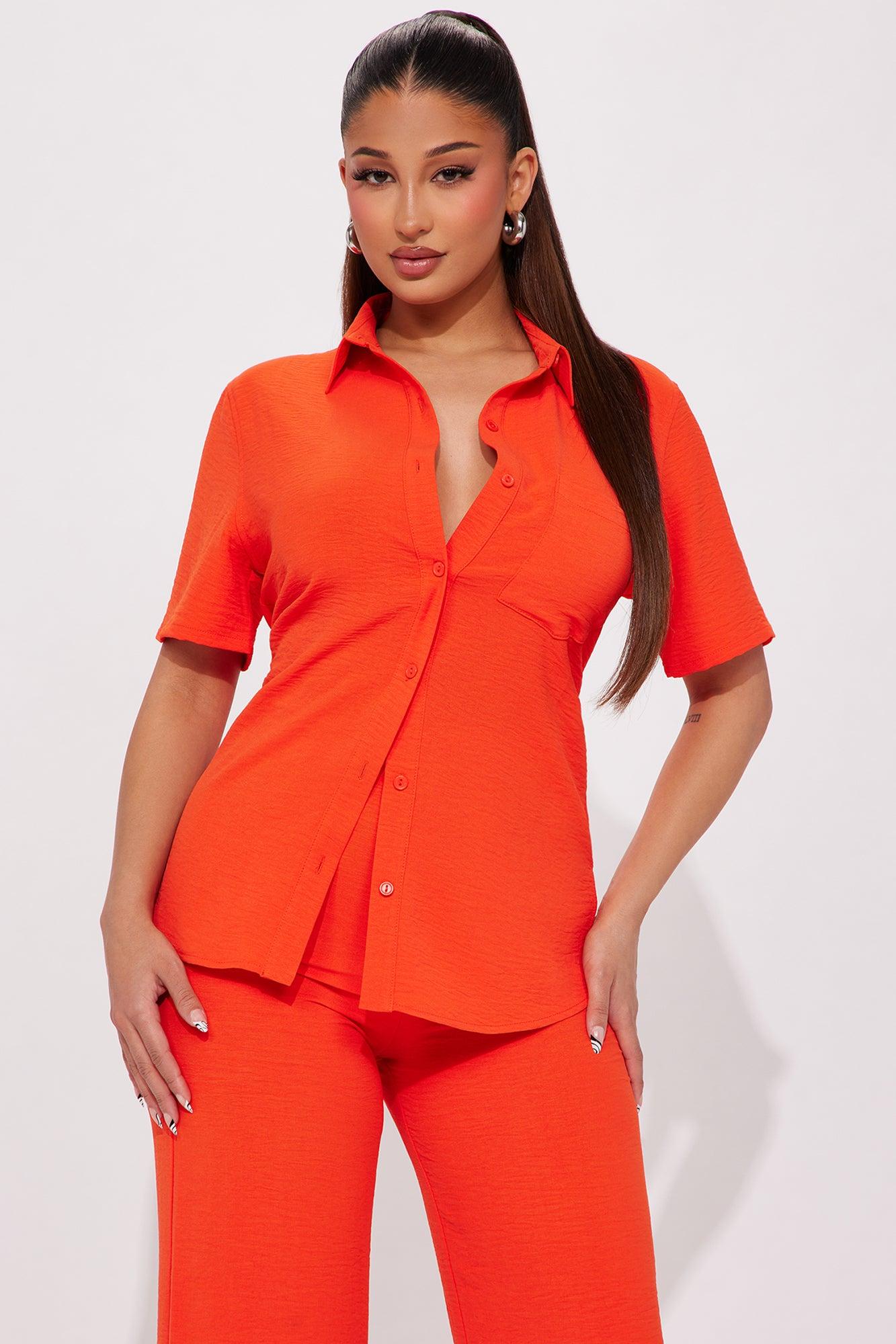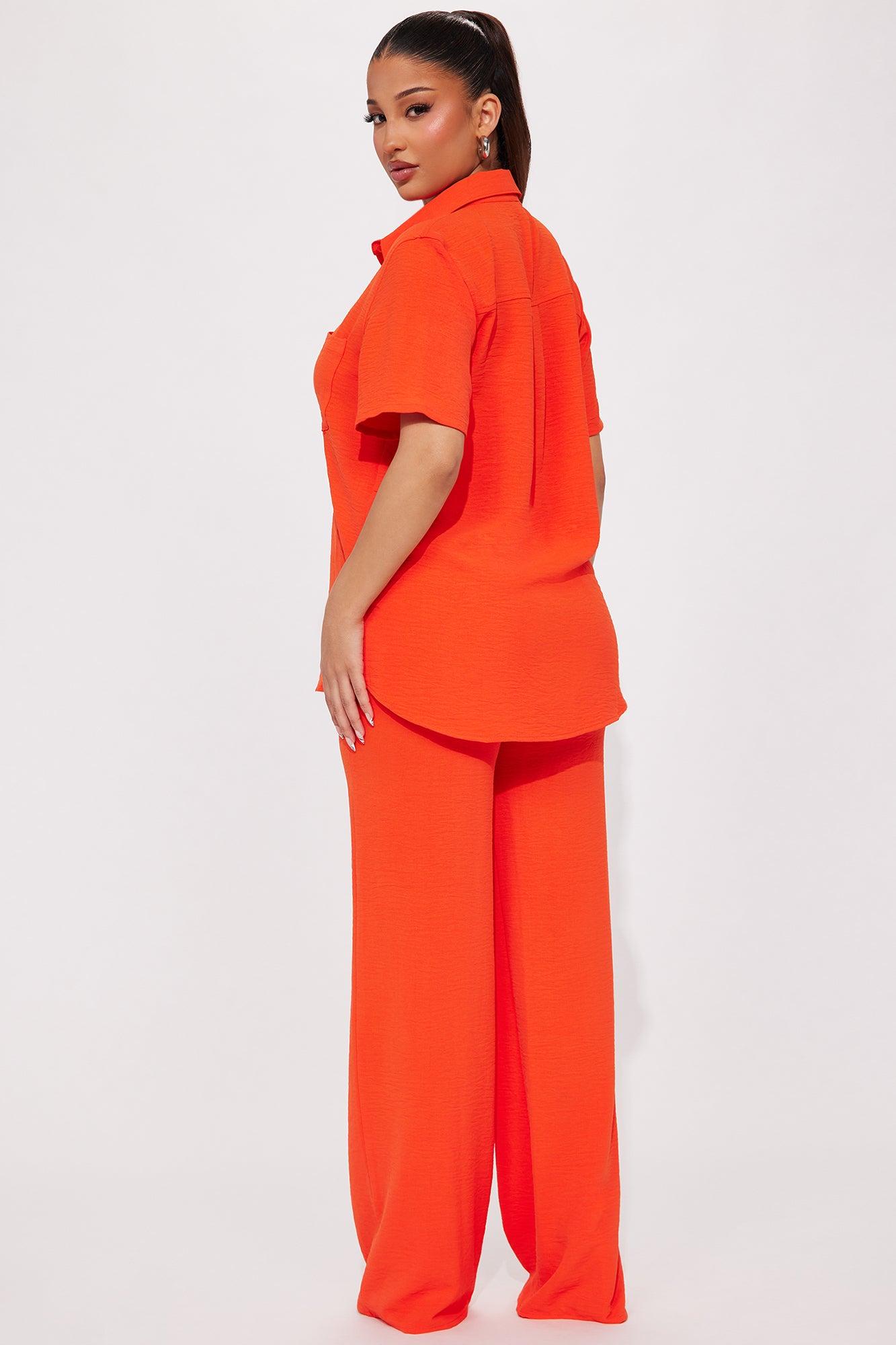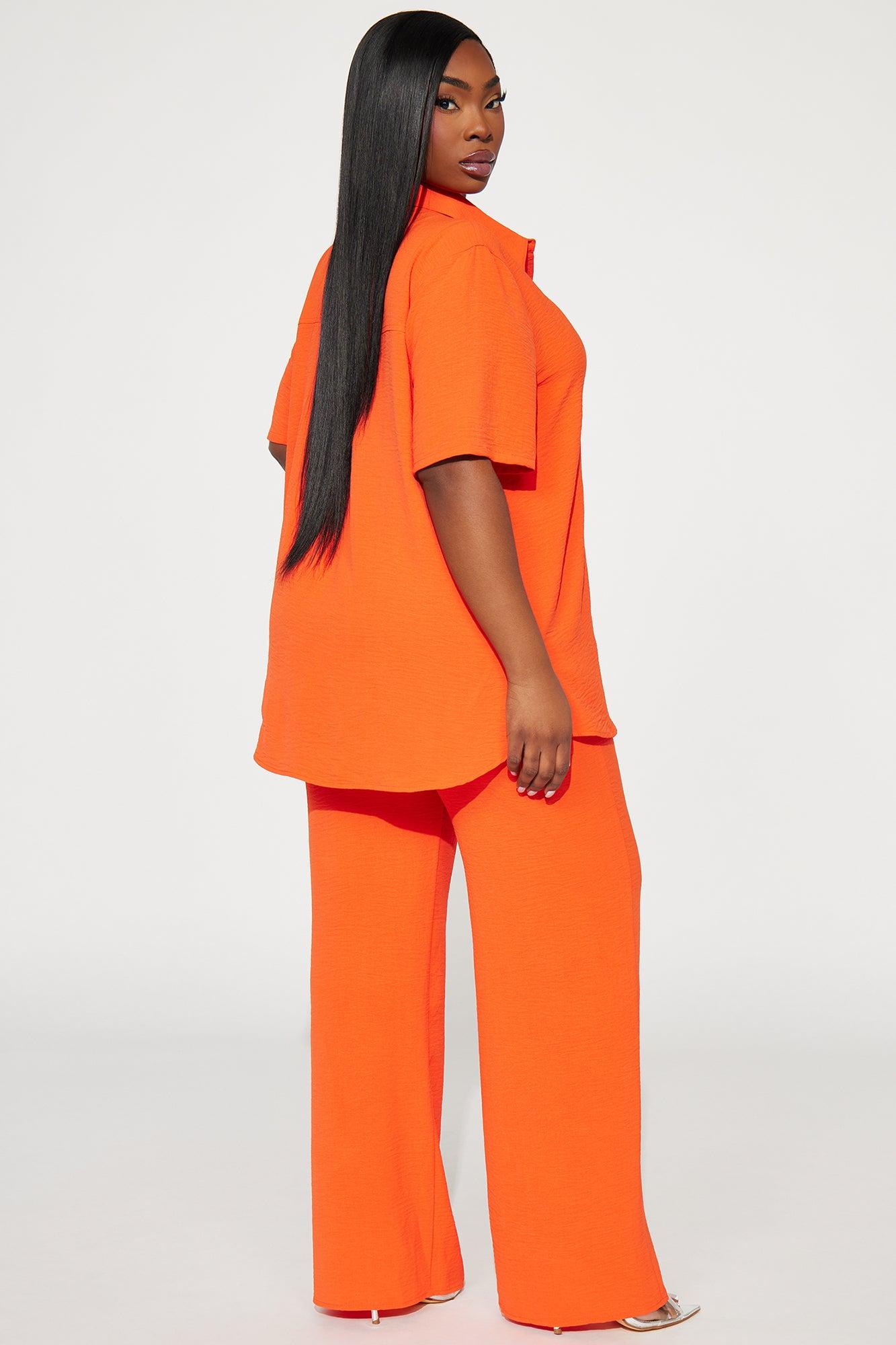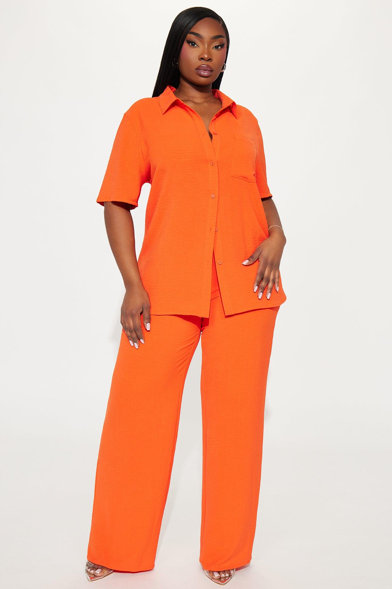 Available In Black, Chartreuse, Dark Brown, Hot Pink, Hunter, Mocha, Oatmeal, Orange, Rust, Slate Blue, Turquoise And Wine. Pant Set Shirt Collar Short Sleeve Button Up Front Pocket Wide Leg Pant Partial Elastic Waistband Non Stretch 33" Inseam 100% Polyester Imported