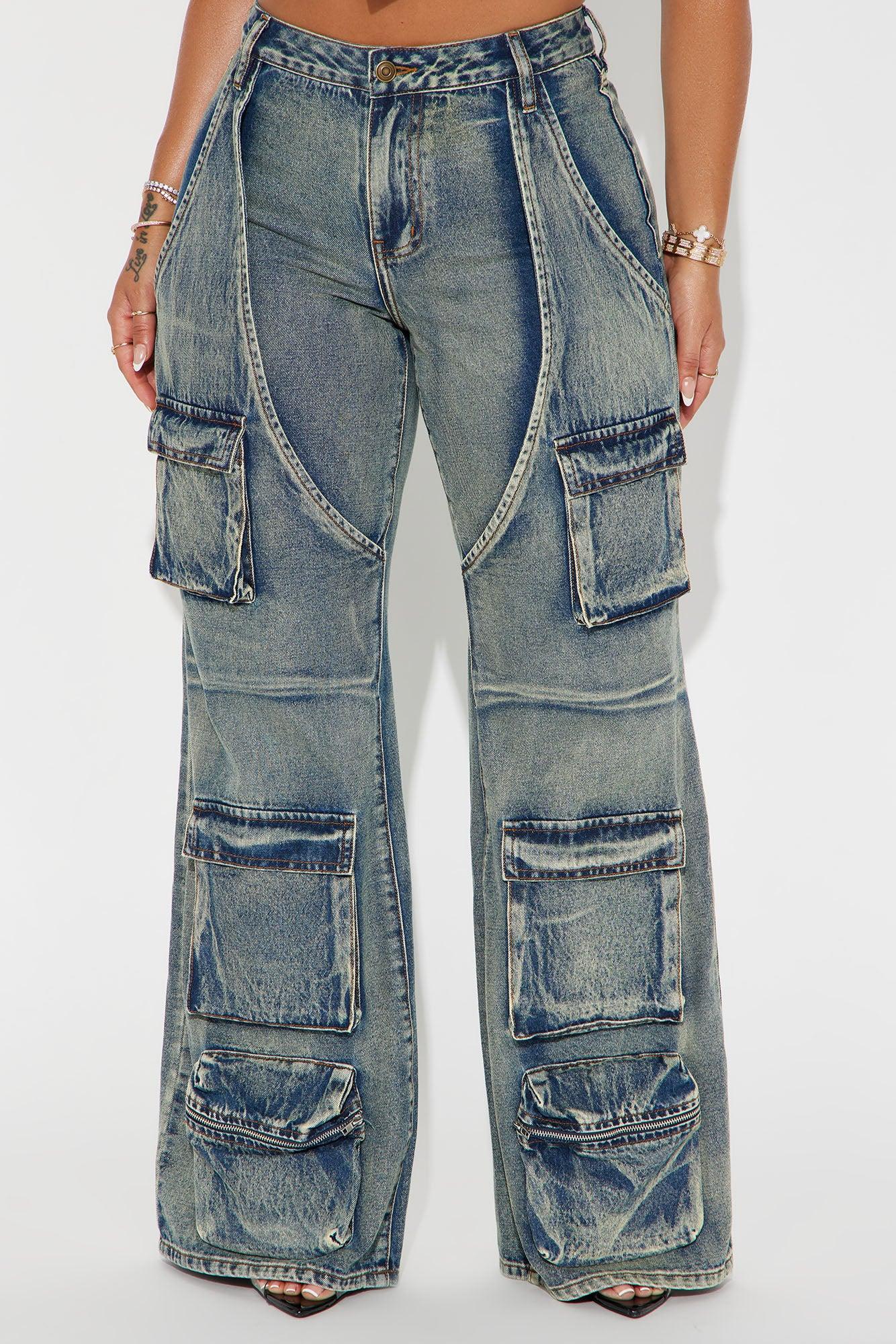 Available In Medium Wash. Wide Leg Jean Functional Cargo Pockets Tinted Seaming Moto Detail 10.25" Mid Rise 33" Inseam Non Stretch Disclaimer: Due To The Specialized Wash, Each Garment Is Unique. 100% Cotton Imported California Proposition 65WARNING: Cancer and Reproductive Harm - www.P65Warnings.ca.gov.