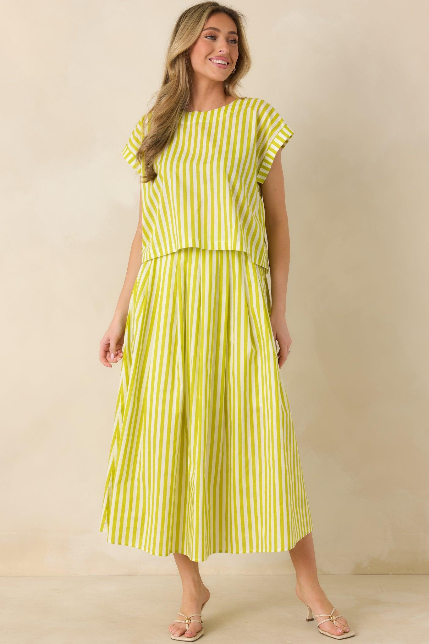 Fresh, feminine, and full of movement — the Making Moves Chartreuse Green Stripe Cotton Maxi Skirt brings effortless polish to your everyday lineup. The green and white vertical stripes feel crisp and confident, while the flowy silhouette creates beautiful motion with every step. Pair it with the matching top for a bold set moment, or style it with a fitted tank for an easy, elevated look. This green high-waisted maxi skirt features vertical stripe detailing designed to elongate the silhouette. Crafted from breathable woven cotton, it offers a lightweight yet structured drape. The waistband sits comfortably at the natural waist, and the full A-line shape provides volume and movement. Elastic waistband for a secure and comfortable fit. 100% Cotton Lining: 100% RayonHand Wash Cold Manufactured in China Designed in The USAModel is 5'8" and Wearing a Size Small, Clipped, Model is a True X-Small
