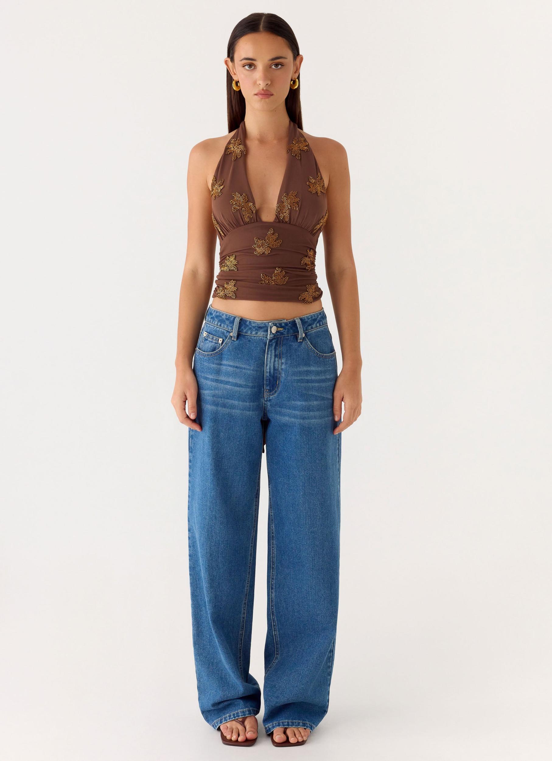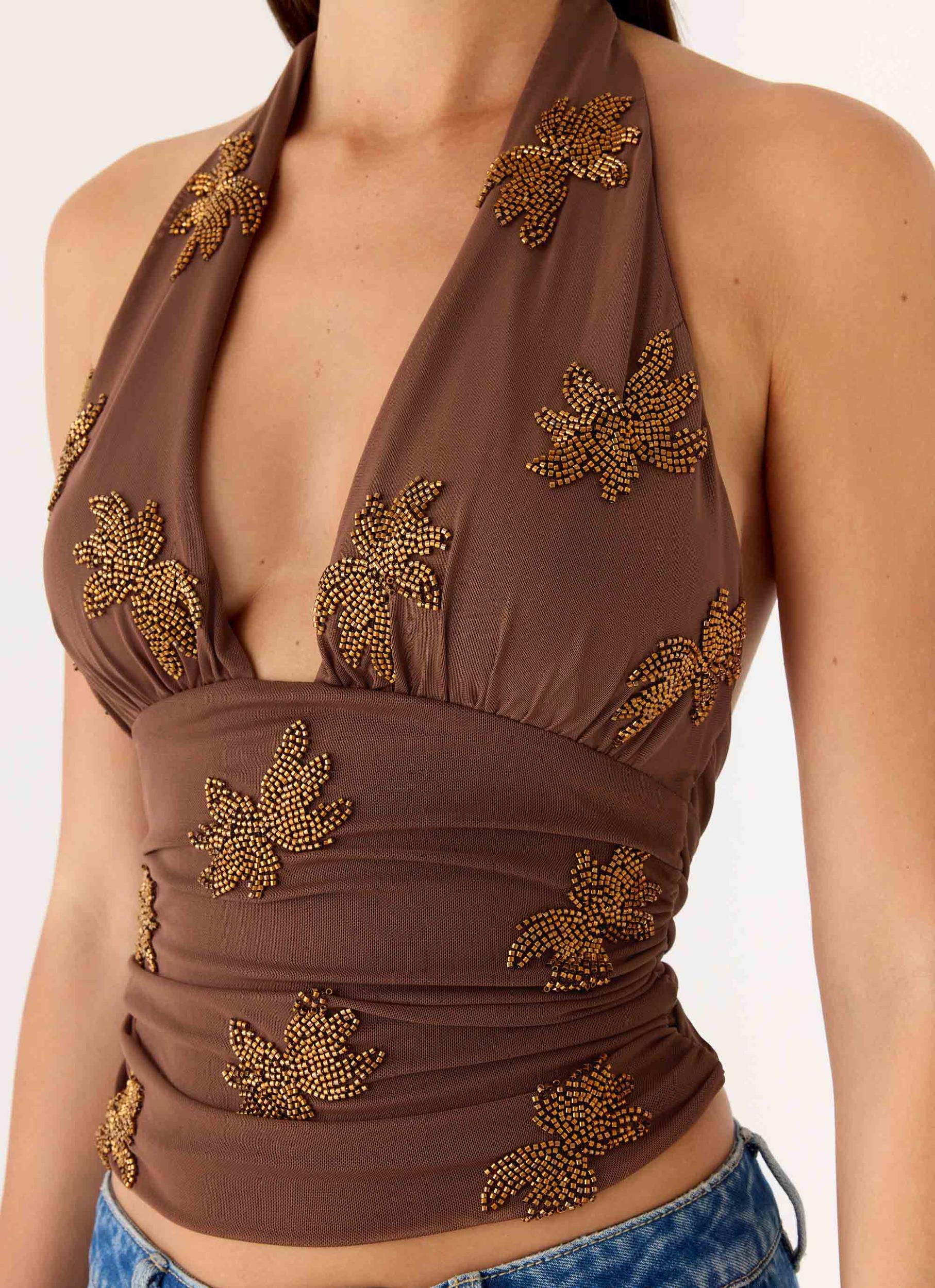 Peppermayo Exclusive The Malachi Beaded Top is designed for nights that call for statement detail and a confident silhouette. Featuring a halter neckline with a deep plunge and intricate beaded embellishment, this style is crafted from soft stretch jersey to contour the body. Finished with an open back and a slim, body-hugging fit for elevated after-dark styling. - Halter neckline with deep plunge- Beaded embellishment- Open back design- Slim, body-hugging fit- Soft stretch fabrication- Fabric: Main: 95% Polyester, 5% Elastane. Lining: 100% Polyester Size AU 8 / US 4 garment measurements:Bust: 74 cm / 29.13 inWaist: 64 cm / 25.20 inHem: 71 cm / 27.95 inLength: 91 cm / 35.83 in Roberta is 177cm and wears size AU 6 / size US 2