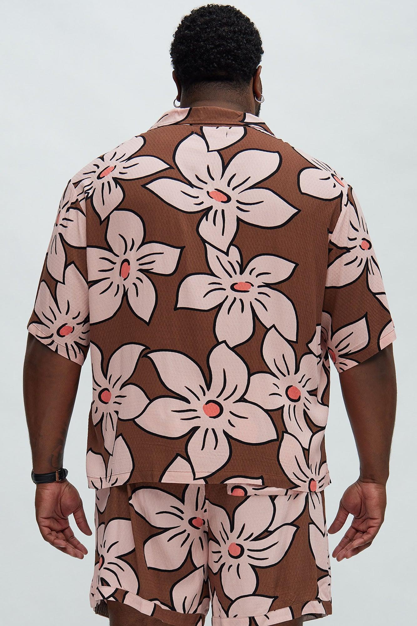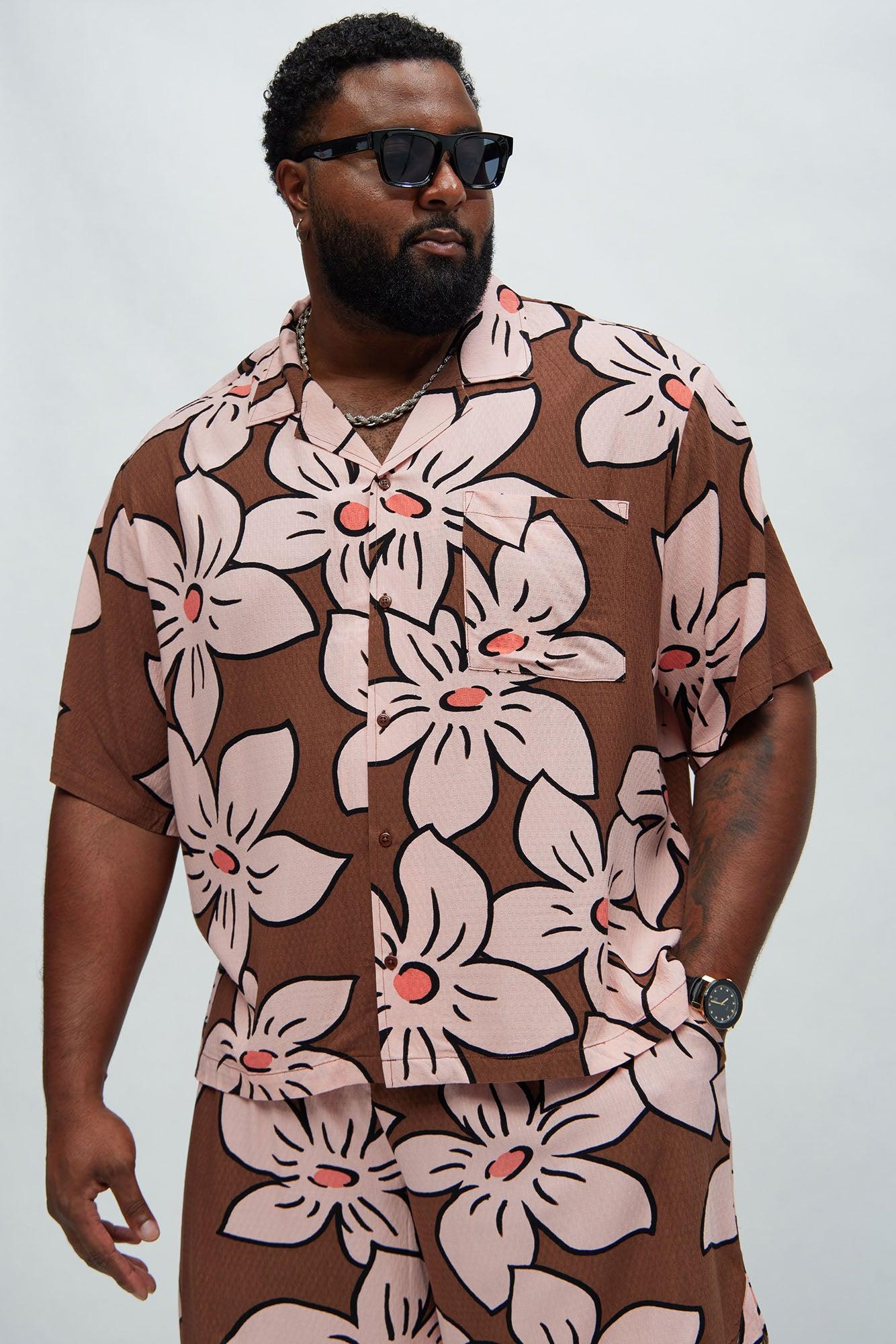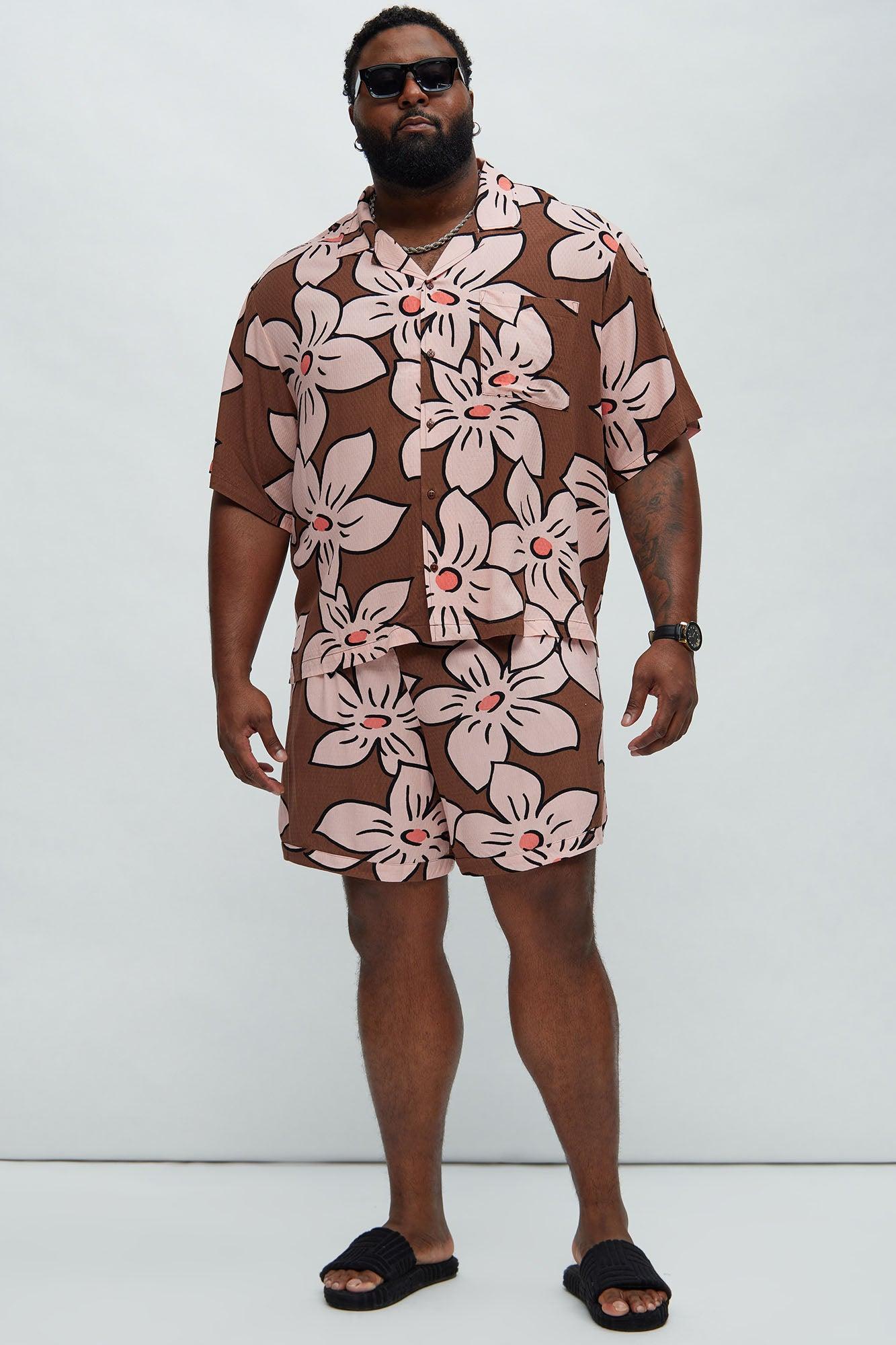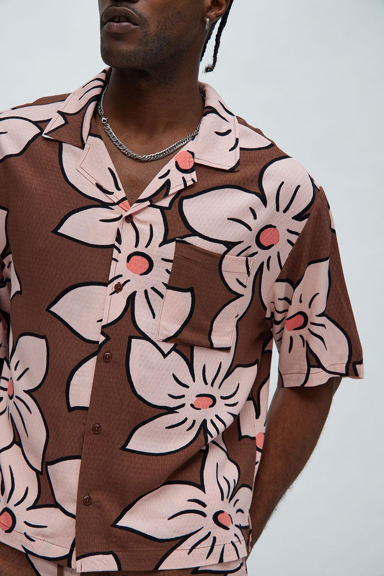 Available In Brown/combo. Fold Down Collar Front Button Closure Chest Pocket Short Sleeve Bottom Side Slit Pair With Malaysia Floral Warmup Shorts Disclaimer: Print Placement May Vary. 100% Viscose Imported
