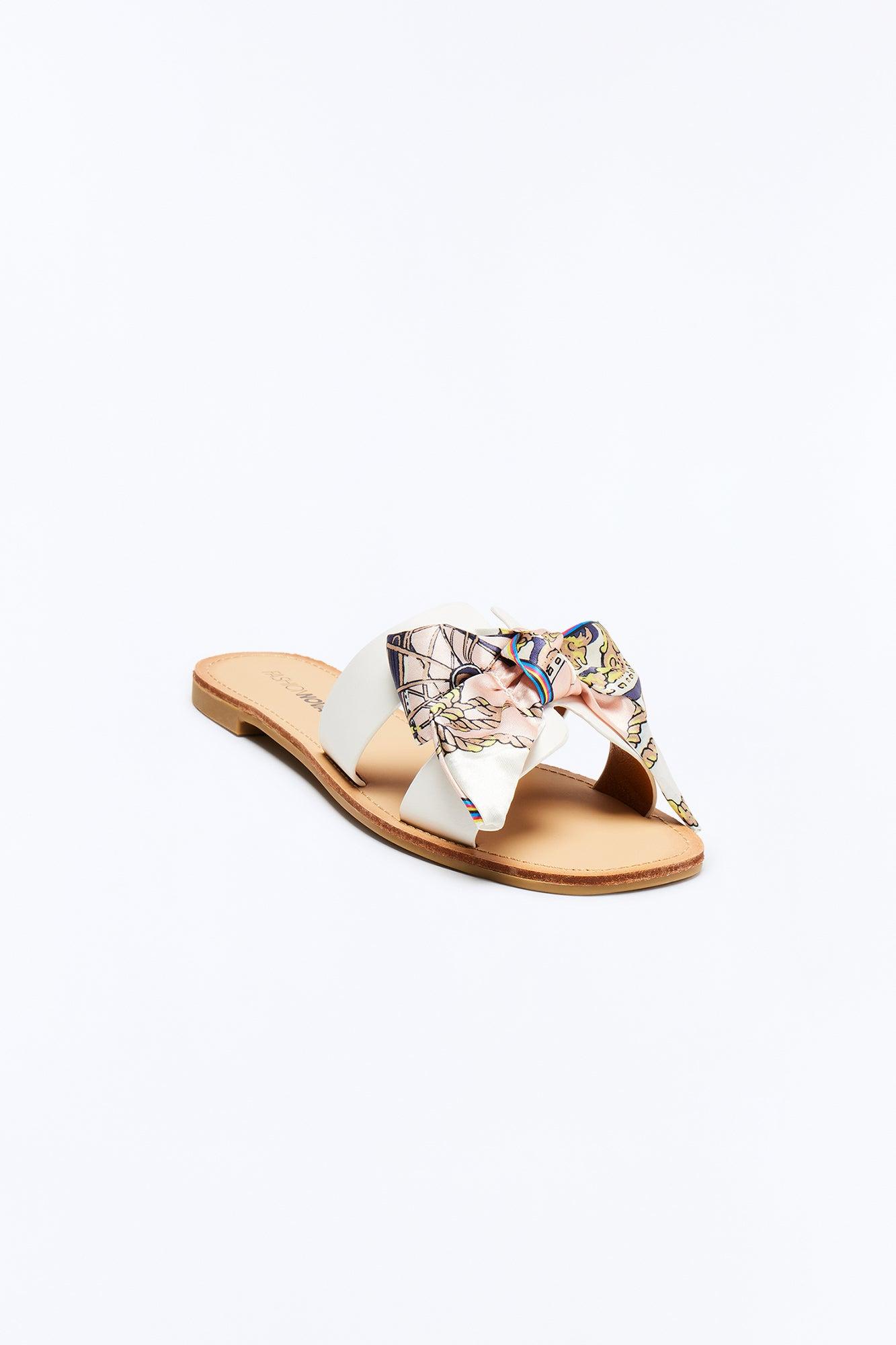 Available In Black, Tan And White. Flat Sandals Novelty Print Scarf Bow Detail Bow Detail Square Toe Flat Heel Disclaimer: Print Placement May Vary. Man Made Materials Imported California Proposition 65WARNING: Cancer and Reproductive Harm - www.P65Warnings.ca.gov.